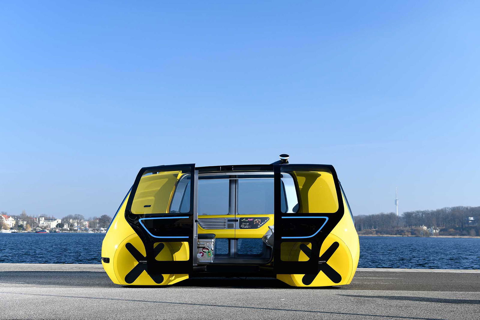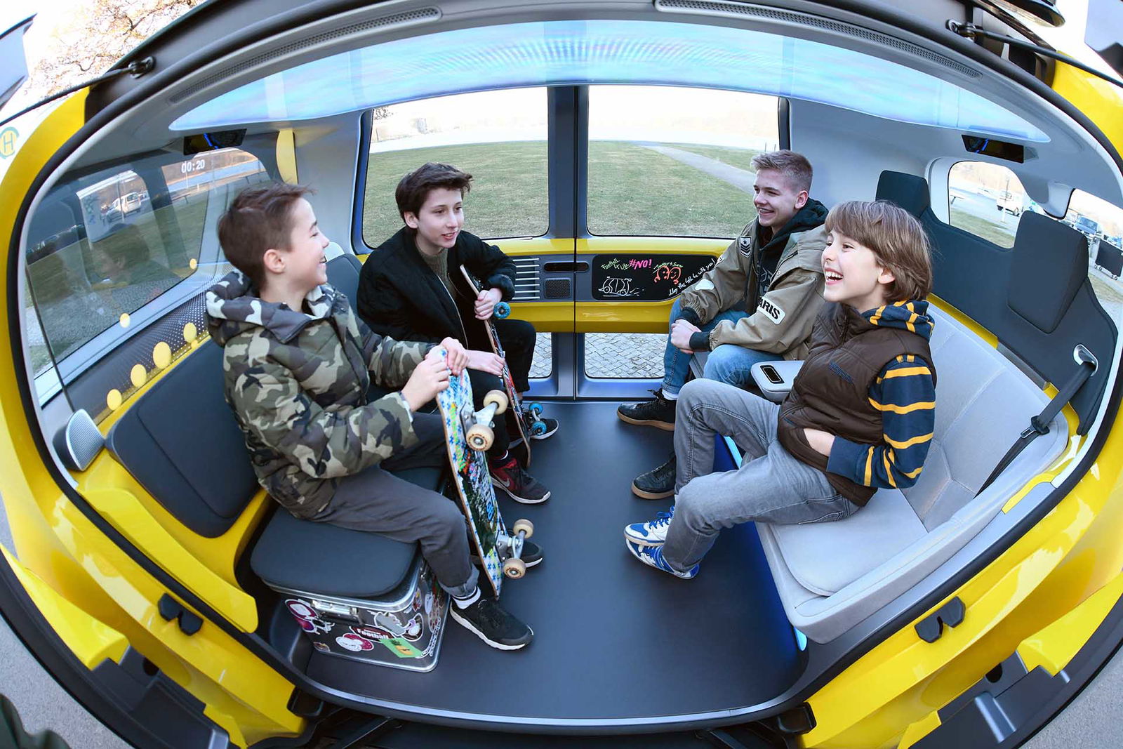 Sedric ha debuttato l’anno scorso in anteprima mondiale al Salone dell’auto di Ginevra e ora è nuovamente protagonista con qualche aggiornamento e nella declinazione School Bus. Il veicolo si caratterizza dal punto di vista estetico per gli esterni proposti in livrea giallo canarino, nel classico stile pulmino scolastico, i graffiti colorati e le scatole in alluminio decorate con adesivi a formare la base per due dei quattro sedili: insomma, soluzioni che lo rendono ideale per il trasporto dei più giovani. Il parabrezza, uno schermo OLED di grandi dimensioni, offre informazioni e intrattenimento a bordo, in base alla tipologia dei passeggeri. Gli spazi interni sono generosi proprio perché non c’è il conducente, non c’è il volante, né tantomeno i pedali. Le batterie sono collocate sotto al pavimento e il motore elettrico si trova all’altezza delle ruote.