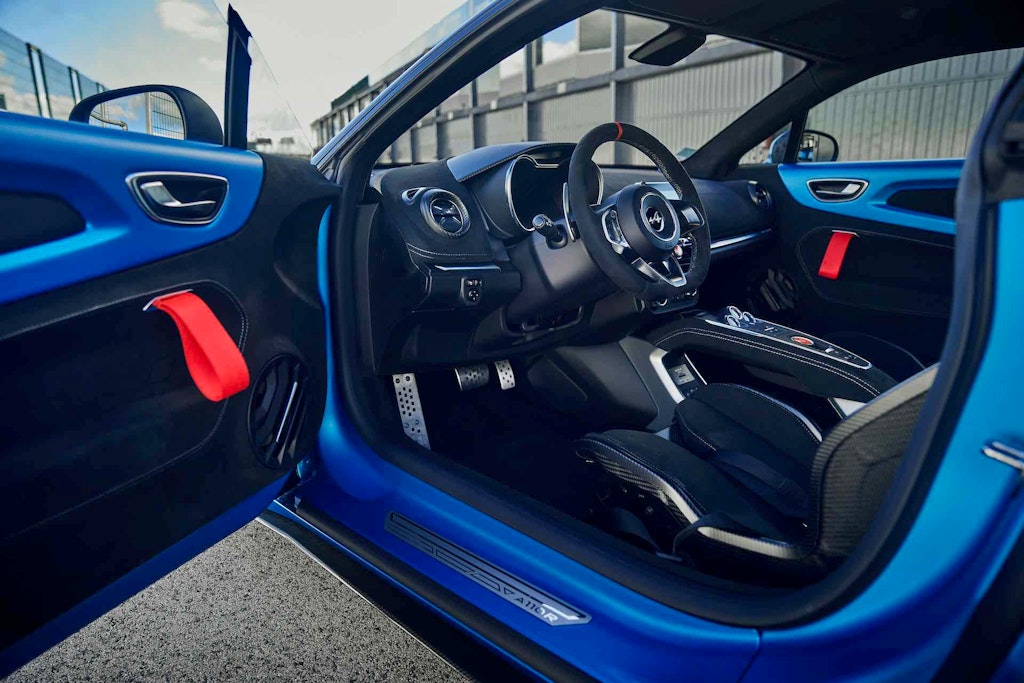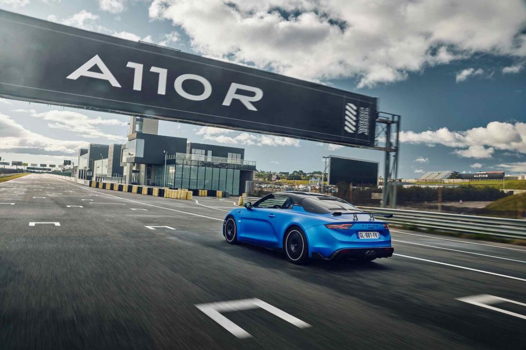 Sulle differenze tra la Alpine A110 R e le “altre”, qualcosa si nota già a prima vista: il colore di lancio è il Blu Racing Mat dell’Alpine A522 di Formula 1. Specifici anche il cofano e il lunotto in carbonio: dettagli che fa una gran scena, certo, ma vanno soprattutto a limare il peso laddove serve di più, cioè nelle parti più alte (o comunque posizionate a mezza altezza). I cerchi da 18” sono realizzati in carbonio, andando così a diminuire le masse non sospese, tanto importanti quando si parla di handling tanto per cambiare di pneumatici semi-slick Michelin Pilot Sport Cup 2.