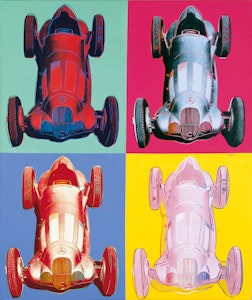 Nella collezione di lavori intitolata “Cars”, Warhol si dedica per la prima volta a un prodotto industriale di matrice europea. Dopo soggetti commerciali stelle e strisce replicati all’infinito e fruibili dalle masse, come le bottigliette di Coca-Cola, le lattine di zuppa Campbell’s o le banconote da un dollaro, creati negli anni ’60, un brand leggendario ed esclusivo della storia automobilistica tedesca diventa il centro della sua arte. Non solo, degli otto modelli di veicoli Warhol ne documenta l’evoluzione e la storia che racchiudono.
