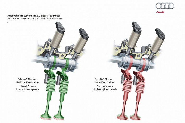 Un 2.0 TFSI, vale a dire turbo a iniezione diretta di benzina, da 190 cv. Bella forza! Esistono sul mercato propulsori d’analoga cubatura e architettura in grado d’erogare potenze ben più elevate. Senza andare lontano, la stessa gamma Audi prevede un 2.0 TFSI da 224 cv. Perché, allora, la Casa di Ingolstadt celebra la nascita del nuovo quadricilindrico? Perché i consumi ora sono degni di un diesel!2.0 TFSI mit 140 kW (190 PS)L’inedita unità è caratterizzata da 4 cilindri in linea e una cilindrata di 1.984 cc; caratteristiche che non rappresentano una novità, essendo ampiamente condivise dai “vecchi” 2.0 TFSI Audi e Volkswagen. Nulla cambia quanto a iniezione, diretta, e alimentazione, a benzina. Ciò che muta profondamente sono i tempi delle diverse fasi del ciclo di combustione: l’aspirazione viene ridotta a vantaggio del prolungamento dell’espansione. Una soluzione che contiene le immissioni di carburante, sfruttandolo in modo più efficiente. Un’idea non propriamente originale, dato che il ciclo Miller già prevede una fase di compressione più breve rispetto alla fase d’espansione, ma sviluppata da Audi in modo tale da non incorrere in eccessive perdite di potenza.AudiValveLiftSystem_01Mentre il ciclo Miller ottimizza i consumi a discapito delle prestazioni, l’inedito 2.0 TFSI tedesco prevede un’iniezione supplementare e la gestione variabile della fasatura e alzata delle valvole, sprigionando così 190 cv e 320 Nm di coppia da 1.450 a 4.400 giri/min, a fronte di una percorrenza media di 20,0 km/l. Valori degni del massimo rispetto, dato che il precedente 2.0 TFSI si attestava sì a 224 cv e 350 Nm, ma percorrendo, nel caso della berlina A4, non più di 16,9 km/l. In aggiunta, l’intero motore pesa solamente 140 kg e promette di raggiungere la temperatura d’esercizio ideale in tempi ridotti rispetto al passato, a tutto vantaggio di un’ulteriore ottimizzazione della combustione e della riduzione delle emissioni inquinanti. I nuovi 2.0 TFSI verranno adottati dalle vetture della gamma Audi dalla fine del 2015.
