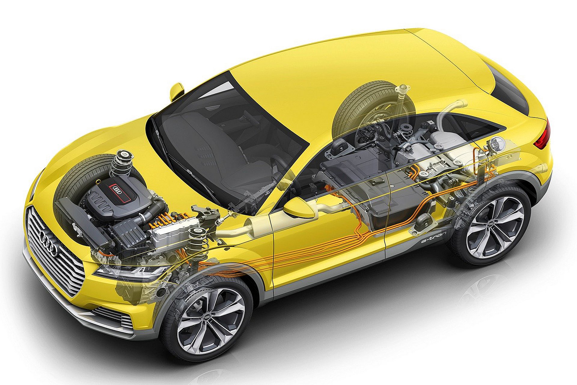 Il nuovo sistema di trazione integrale Audi ha debuttato con la concept TT Offroad, mossa da un 2.0 TFSI (turbo a iniezione diretta di benzina) da 300 cv che, in abbinamento alle due unità elettriche, può contare su di una potenza complessiva di 408 cv e un’autonomia a zero emissioni di 50 km. La prima vettura di serie dotata della tecnologia e-quattro dovrebbe essere la nuova A4, in arrivo entro la fine del 2015, cui farà seguito nel 2017 la crossover sportiva TTQ, derivata dalla coupé TT.