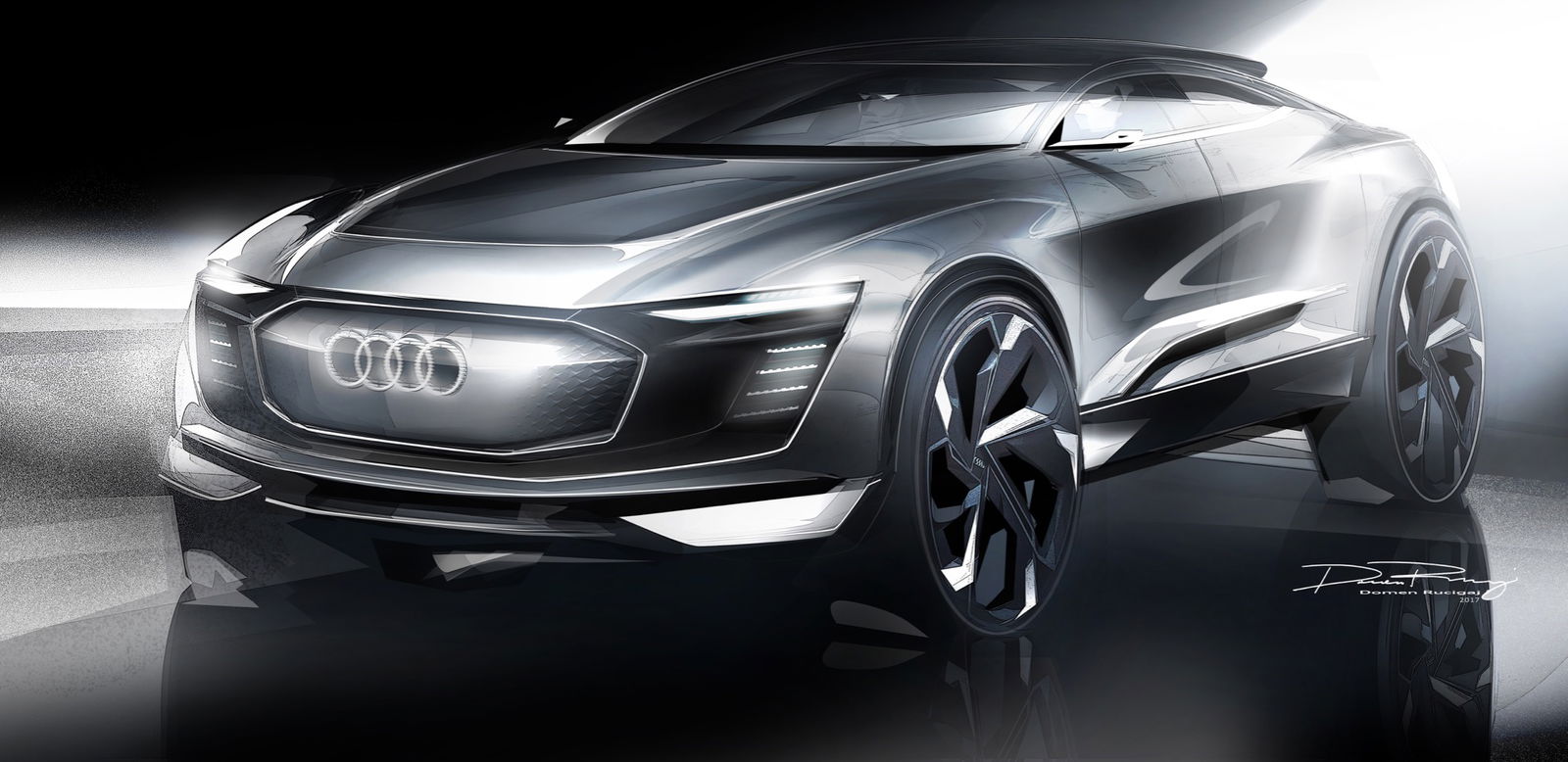 La batteria agli ioni di litio è sotto l’abitacolo, per abbassare il baricentro e ottenere un’adeguata distribuzione dei pesi (52-48 anteriore-posteriore). Due le possibilità di ricarica, con attacco per corrente alternata (AC) e continua (DC). Le dimensioni dichiarate avvicinano l’Audi e-tron Sportback concept al Q7; imponenti le ruote di 23 pollici di diametro. Interessante la soluzione delle telecamere al posto dei retrovisori esterni.