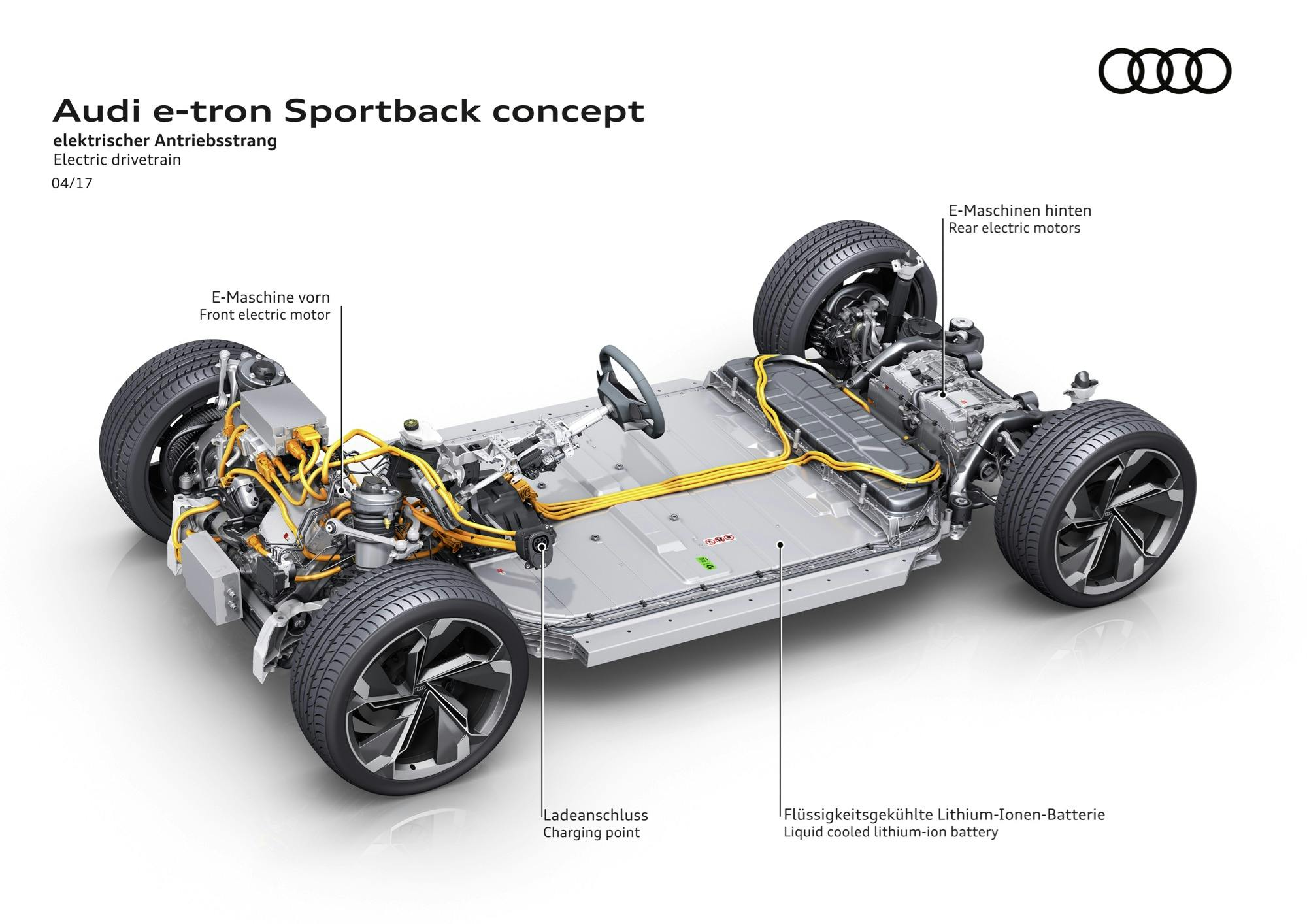 Sotto la carrozzeriaLe informazioni rese note si soffermano sulla componente motrice del concept, ribadendo che lo stesso schema sarà seguito per il futuri modelli Audi a trazione totalmente elettrica. I motori sono tre, uno sull’asse anteriore e due su quello posteriore, con l’idea di ricreare i vantaggi dinamici della trazione quattro. Nel caso del’Audi e-tron Sportback concept la potenza è pari a 435 cv (320 kW), che diventano 503 (370 kW) in modalità “boost”, con accelerazione da 0 a 100 km/h in 4″5, a fronte dell’autonomia dichiarata fino a 500 km (ciclo NEDC).