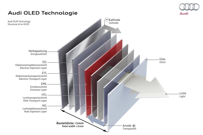 Diodi di origine organica, destinati al retrotreno. Una rivoluzione. Grazie a tale tecnologia, infatti, la Casa di Ingolstadt promette di ridurre drasticamente lo spessore delle superfici illuminanti e al tempo stesso “piegarle” a qualsiasi utilizzo. La struttura è composta da unità contenenti due elettrodi e svariati strati di materiali semi-conduttori dallo spessore inferiore al millesimo di millimetro (!), attivate da una corrente alternata di 3-4 Volt. A fornire la connotazione cromatica è la composizione chimica dei materiali.Diversamente dai comuni LED, la luce non è puntiforme bensì distribuita attraverso la superficie, a tutto vantaggio dell’omogeneità d’illuminazione. In aggiunta, è possibile modificare in tempo reale l’intensità luminosa e non sono necessari componenti aggiuntivi; ad esempio per il raffreddamento del sistema. Una soluzione che promette di rafforzare ulteriormente l’adattività delle unità Matrix di tipo predittivo, funzionanti anche in base ai dati forniti dal sistema di navigazione e pertanto anticipatamente rispetto al percorso affrontato.