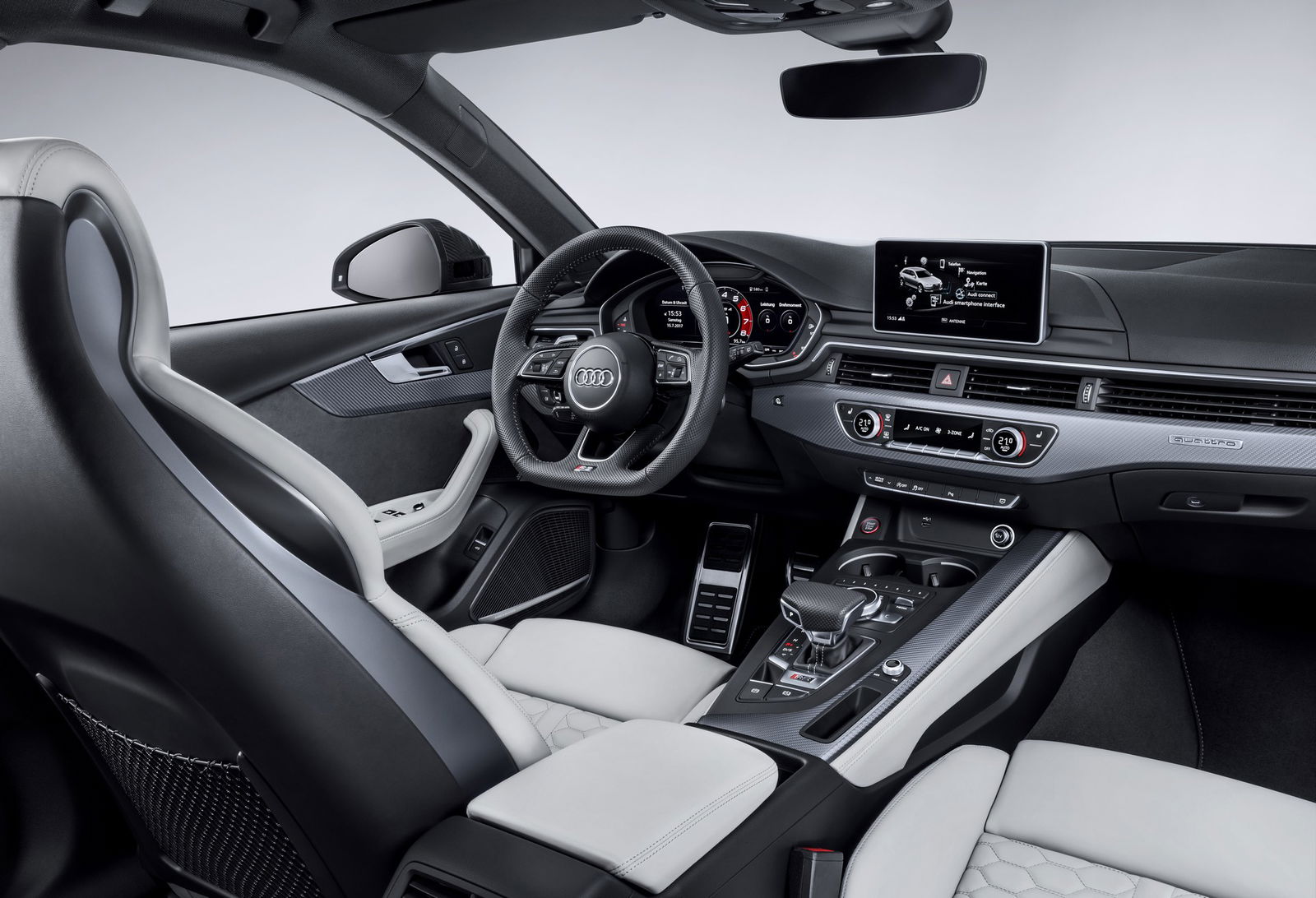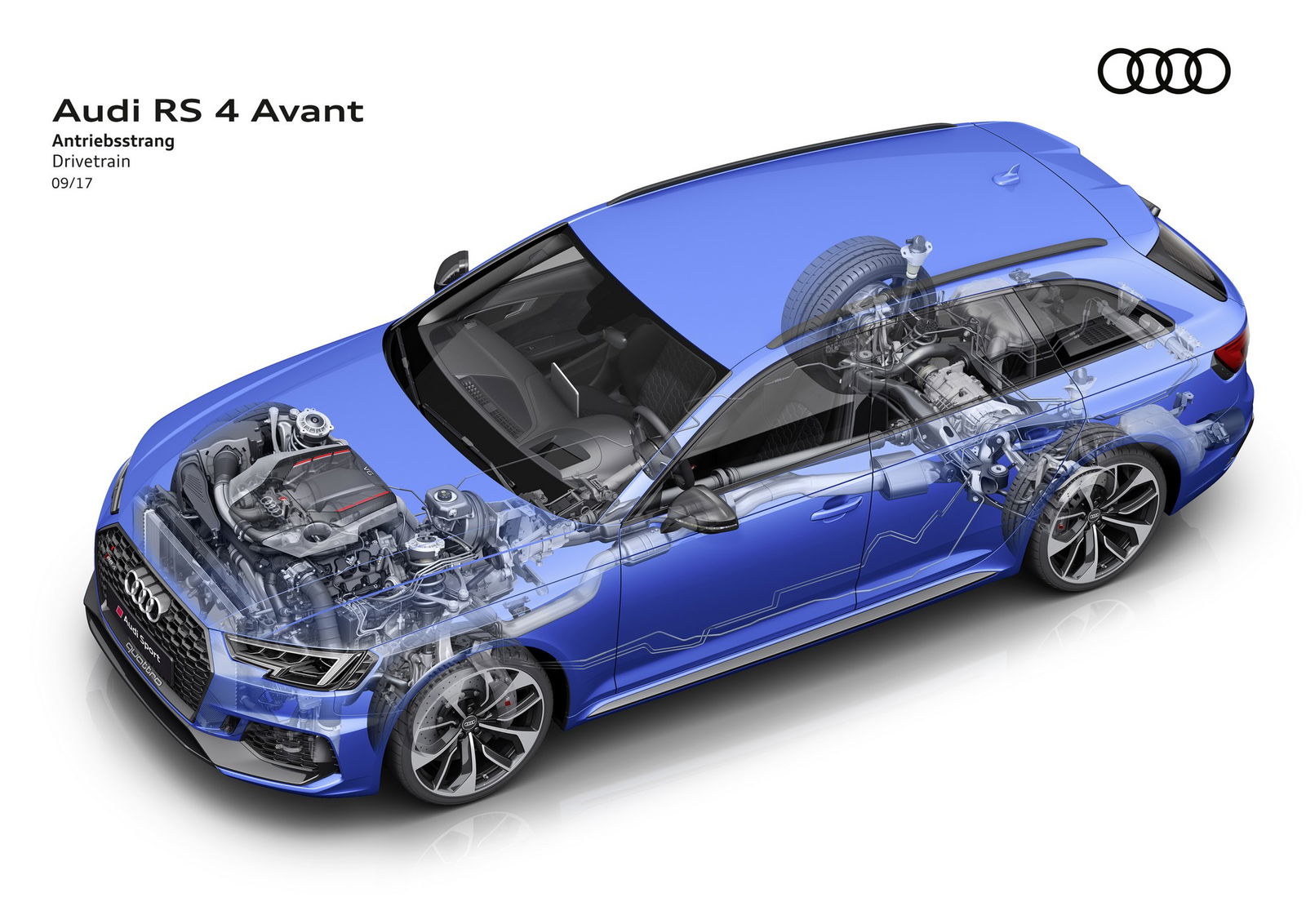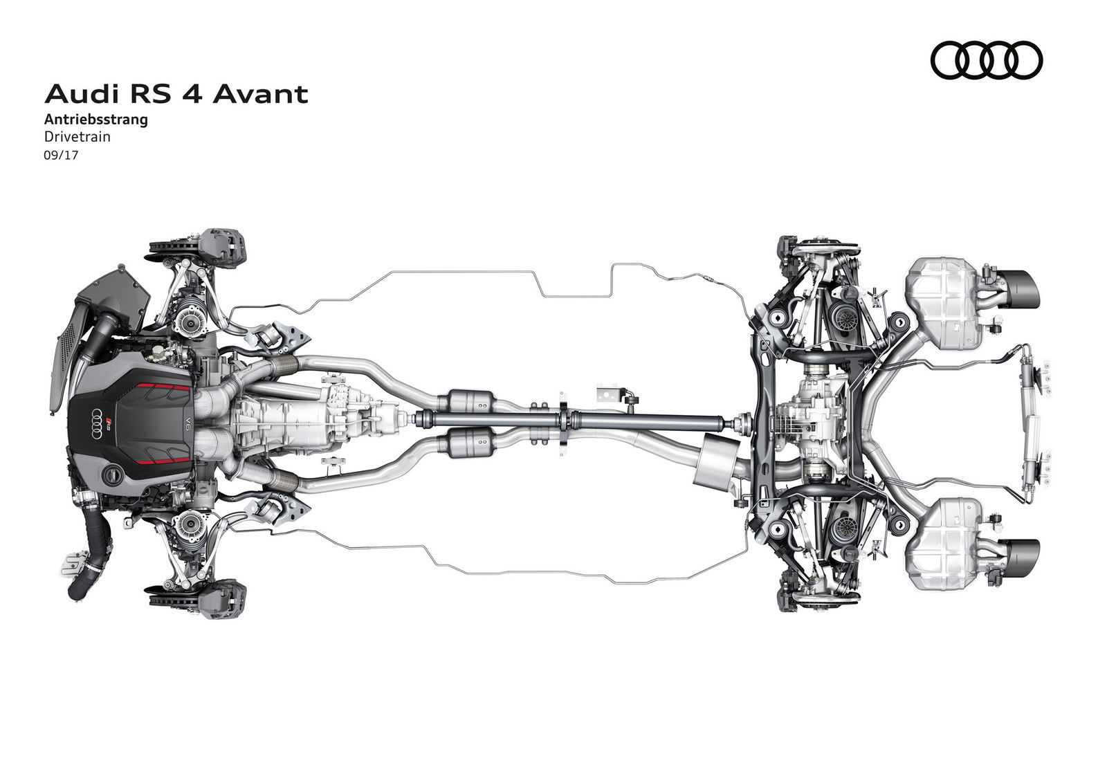 Trazione integrale quattroSportiva o wagon? Con 450 cv e 600 Nm, la nuova RS4 Avant potrebbe appartenere a entrambe le categorie. Merito dell’inedito 6 cilindri a V di 2,9 litri a iniezione diretta della benzina, sovralimentato mediante due turbocompressori e abbinato alla trazione integrale quattro. Un’unità che sostituisce il “vecchio” V8 e porta in dote un incremento della coppia di 170 Nm, cui si accompagnano uno scatto da 0 a 100 km/h in 4,1 secondi oltre a una velocità massima di 250 km/h, incrementabile a 280 km/h optando per il pacchetto RS Dynamic. Prestazioni alle quali contribuiscono il cambio automatico a 8 rapporti tiptronic del tipo mediante convertitore di coppia e il peso ridotto di 80 kg.