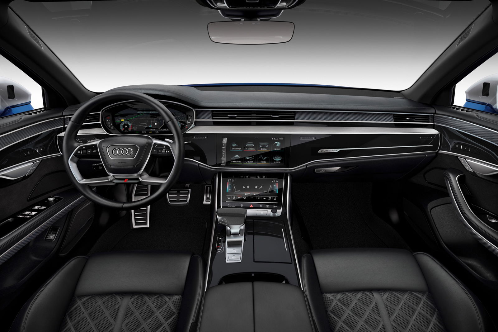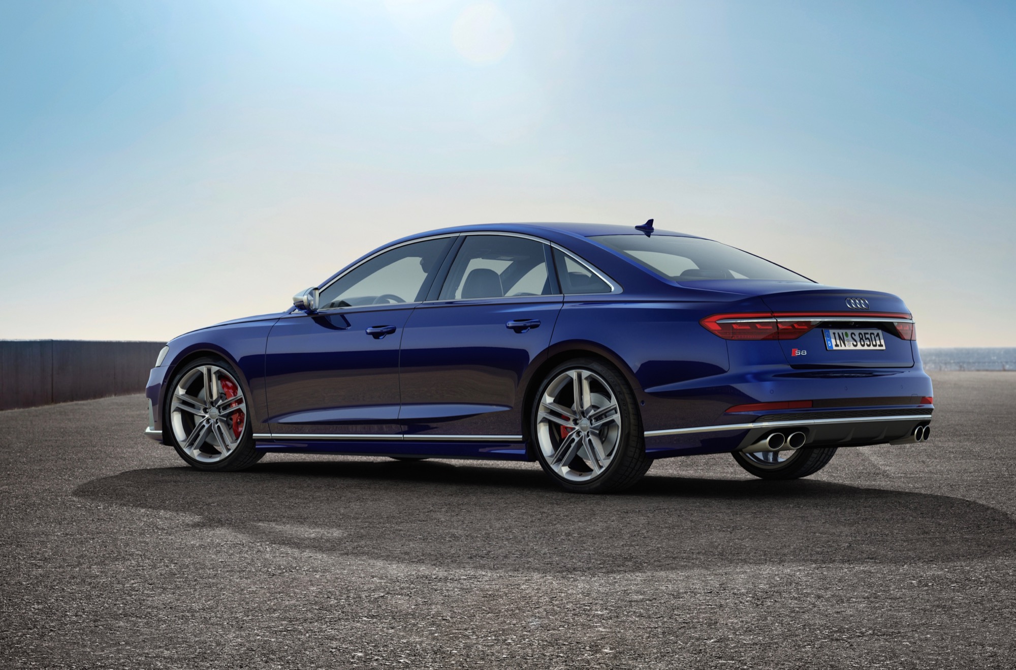 Lo sterzo dinamico sulle quattro ruote rende più agevoli le manovre – grazie alla rotazione in controfase a bassa velocità – e aumenta la stabilità sul veloce, quando le ruote posteriori girano in fase. Contribuisce efficacemente alla dinamica di guida la trazione integrale quattro con differenziale sportivo. Tra gli optional figurano i dischi carboceramici, che permettono tra l’altro di risparmiare circa 10 kg di peso rispetto a quelli in acciaio.Passando all’aspetto della nuova Audi S8, che è lunga 5,17 metri e può montare cerchi sino a 21″, la scelta del colore carrozzeria è ampia, con nove proposte; all’interno le opzioni sono ancora più ampie e includono il pacchetto Audi design selection argento pastello, che dona all’abitacolo un’atmosfera da lounge, nonostante la versione a passo lungo sia disponibile soltanto in Cina, USA, Canada e Corea del Sud.