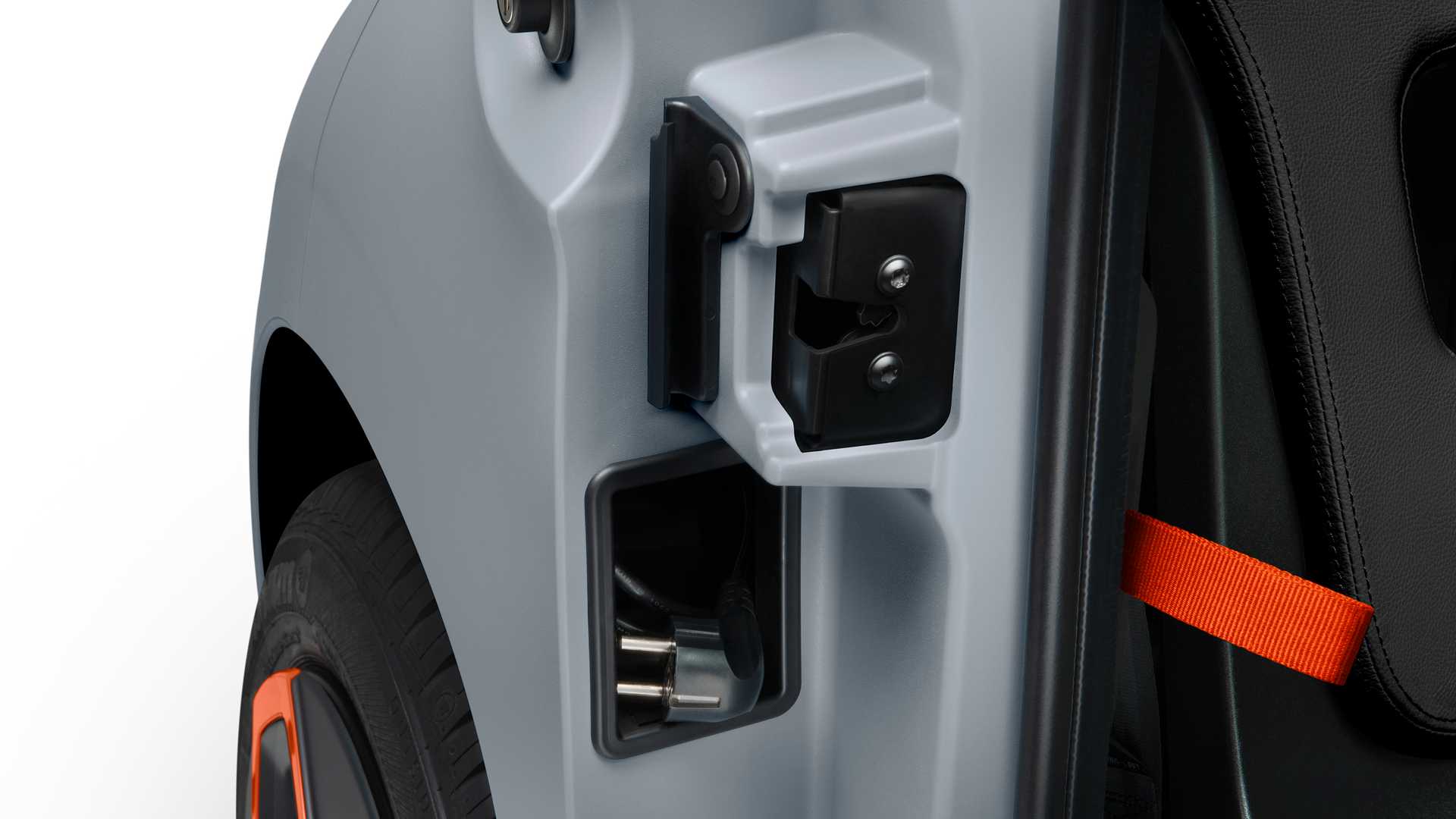 Più le dimensioni sono compatte, più ogni centimetro dev’essere sfruttato fino in fondo. Ecco perché il parabrezza è quasi verticale, così come il lunotto. Da segnalare l’apertura asimmetrica delle portiere: “controvento” sul lato guida, tradizionale a sinistra. Le dimensioni, dicevamo: 2,41 metri di lunghezza, ma soprattutto 7,2 metri di diametro di sterzata. Ovvio che in un’auto così piccola non ci possano stare più di due persone, che godono però di una luminosità davvero unica, grazie alle superfici vetrate quasi senza soluzione di continuità a 360°.