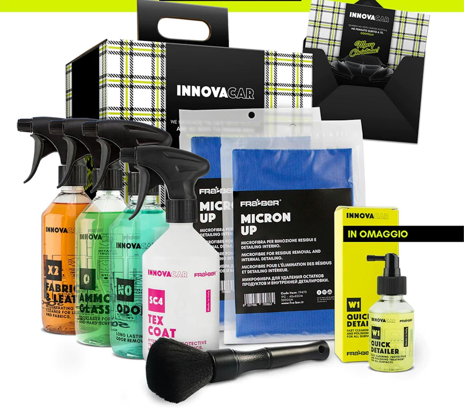 Il marchio di car detailing Innovacar per il Natale 2022 propone i kit per la pulizia auto in confezione regalo, con biglietto di auguri compreso nella scatola (la spedizione è gratuita). La linea Natale Innovacar si compone di 5 tipologie di kit, che abbracciano vari usi, compreso quello professionale, e sono pensati per essere utilizzati su qualsiasi tipologia di auto. Il kit che contiene prodotti per prendersi cura degli interni dell’auto viene recapitato completo di: pulitore pelle e tessuti auto; spray impermeabilizzante per tessuti e pelle auto; Glass cleaner e pulitore per vetri auto privo di ammoniaca; prodotto che elimina gli odori; pennello a setole morbide per car detailing; due panni in microfibra per rimozione prodotti e detailing interni. Nella confezione è incluso un prodotto con effetti lucidanti e protettivi. Per scoprire tutti i kit il sito da consultare è questo: innovacar.it
