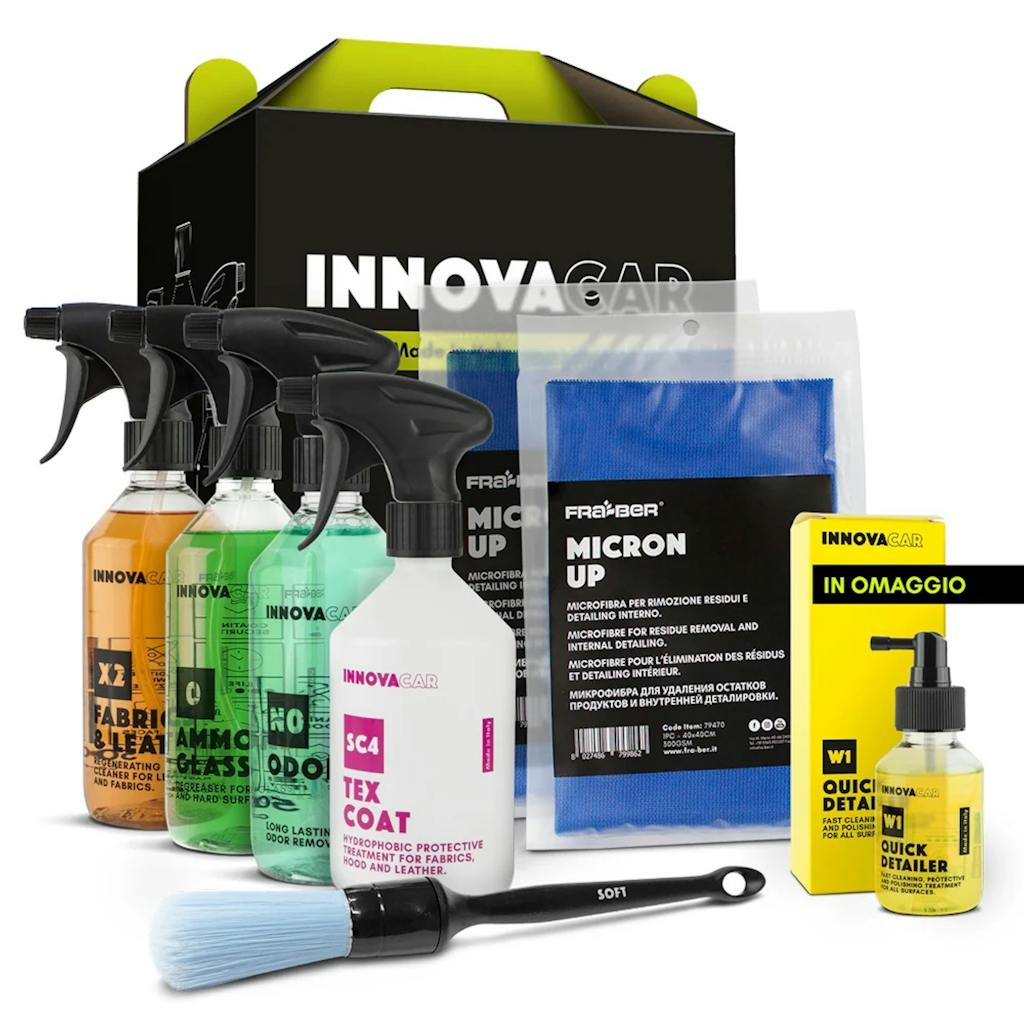 Il kit per pulizia dell’interno dell’auto di Innovacar contiene tutti i prodotti necessari per prendersi cura nel dettaglio degli interni dell’auto. Il kit standard si compone, tra gli altri, di uno spray impermeabilizzante per tessuti e pelle auto; pulitore per vetri senza ammoniaca; deodorante per rimuovere ed eliminare odori; pennello a setole morbide per car detailing e due panni in microfibra per rimozione prodotti e detailing interni. In omaggio Innovacar offre il prodotto W1 Quick Detailer da 100 ml, ossia un pulitore rapido con effetti lucidanti e protettivi. Sul sito del marchio si trovano le istruzioni per utilizzare correttamente il kit.