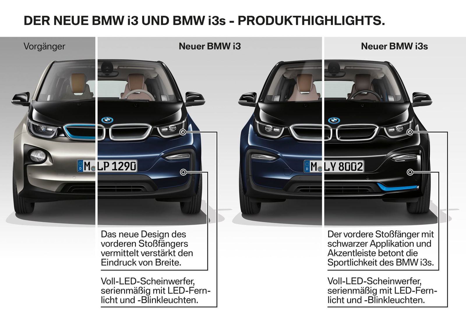 L’elettrica bavarese sfila sotto i riflettori in due versioni ben distinte. Da una parte la normale i3, elegante e raffinata, dall’altra la i3s, che strizza l’occhio alla clientela più sportiva. A fare loro da denominatore comune ci sono soluzioni stilistiche inedite, che cercano di far sembrare la macchina più larga e meglio piantata sulla strada. Il riferimento è in particolare ai fascioni paraurti e alle prese d’aria frontali. Nel caso della i3s questa non è però solo una sensazione: sotto i passaruota allargati e bordati di nero le carreggiate si allargano davvero di 40 mm, mentre l’assetto si abbassa di 10 mm, adottando anche molle, ammortizzatori e barre stabilizzatrici specifiche.