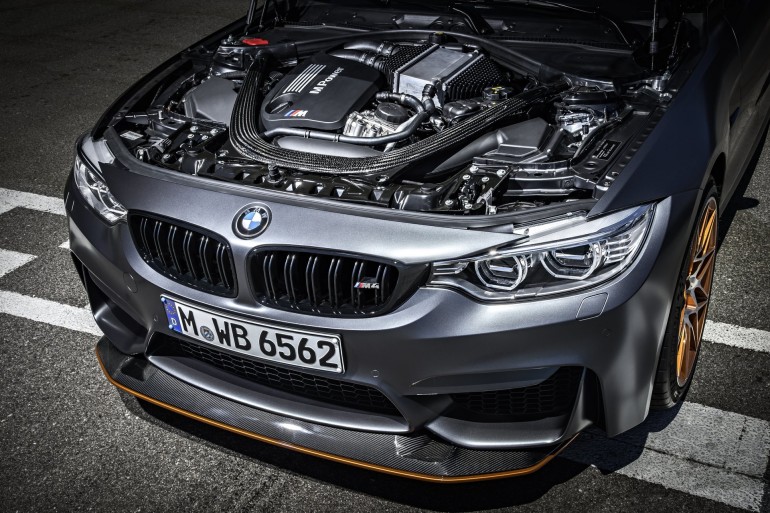 L’assetto, ampiamente regolabile, prevede una classica soluzione a molle elicoidali e ammortizzatori telescopici, mentre l’impianto frenante si avvale di dischi carboceramici di serie. La vera “perla” dentro la conchiglia è il 6 cilindri in linea biturbo di 2.979 cc a iniezione diretta di benzina, portato dagli originari 431 cv e 550 Nm di coppia a 500 cv e 600 Nm. Un upgrade radicale, ottenuto grazie alla rimappatura della centralina e all’iniezione d’acqua volta a migliorare le prestazioni a fronte di una riduzione dei consumi; un obiettivo perseguito vaporizzando il liquido nei condotti d’aspirazione al fine di abbassare le temperature dell’aria in ingresso e favorire la combustione. M4 GTS, proposta esclusivamente con la trasmissione a doppia frizione a 7 rapporti, scatta da 0 a 100 km/h in 3,8 secondi e raggiunge i 305 km/h a fronte di una percorrenza media (11,4 km/l) identica alla “normale” M4. Quest’ultima accreditata di uno 0-100 km/h in 4,3 secondi e 250 km/h.