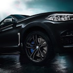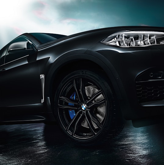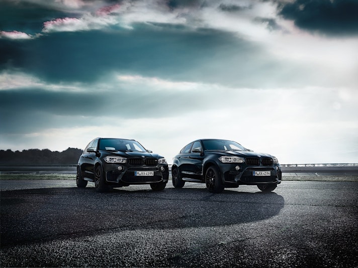 Nero assolutoAlla carrozzeria totalmente nera, X5 e X6 M in edizione speciale vedono aggiungersi le calotte dei retrovisori laterali in carbonio, la calandra – immancabilmente – in nero, i cerchi in lega dedicati da 21 pollici e le pinze dei freni M nel classico blu. La lotta a qualsiasi espressione cromatica prosegue in abitacolo, dato che gli interni in pelle Merino sono, manco a dirlo, neri con inserti rossi. Un contrasto ripreso dal cruscotto e dai pannelli porta, mentre il volante è disponibile in configurazione M, rivestita in cuoio, oppure M Performance, in Alcantara.Il motore della M5Sotto il “vestito” solo conferme. X5 e X6 M si affidano, da tradizione, al possente V8 4.4 biturbo a iniezione diretta della benzina da 575 cv e 750 Nm, chiamato a lavorare in abbinamento al cambio automatico Steptronic a 8 rapporti del tipo mediante convertitore di coppia. Un’unità che, a dispetto della mole delle vetture, porta in dote uno scatto da 0 a 100 km/h in 4,2 secondi e una velocità massima, autolimitata, di 250 km/h. Un propulsore tecnicamente raffinato, caratterizzato dagli iniettori piezoelettrici con pressione massima d’esercizio di 200 bar, dalla fasatura variabile lato aspirazione e scarico e dalla collocazione dei turbocompressori, così come dei catalizzatori, tra le bancate, onde permettere un’inusuale declinazione della tecnologia twin scroll, dato che ciascuno dei 4 collettori di scarico trae origine da entrambe le bancate. X5 e X6 M non hanno mai avuto un’anima così nera.