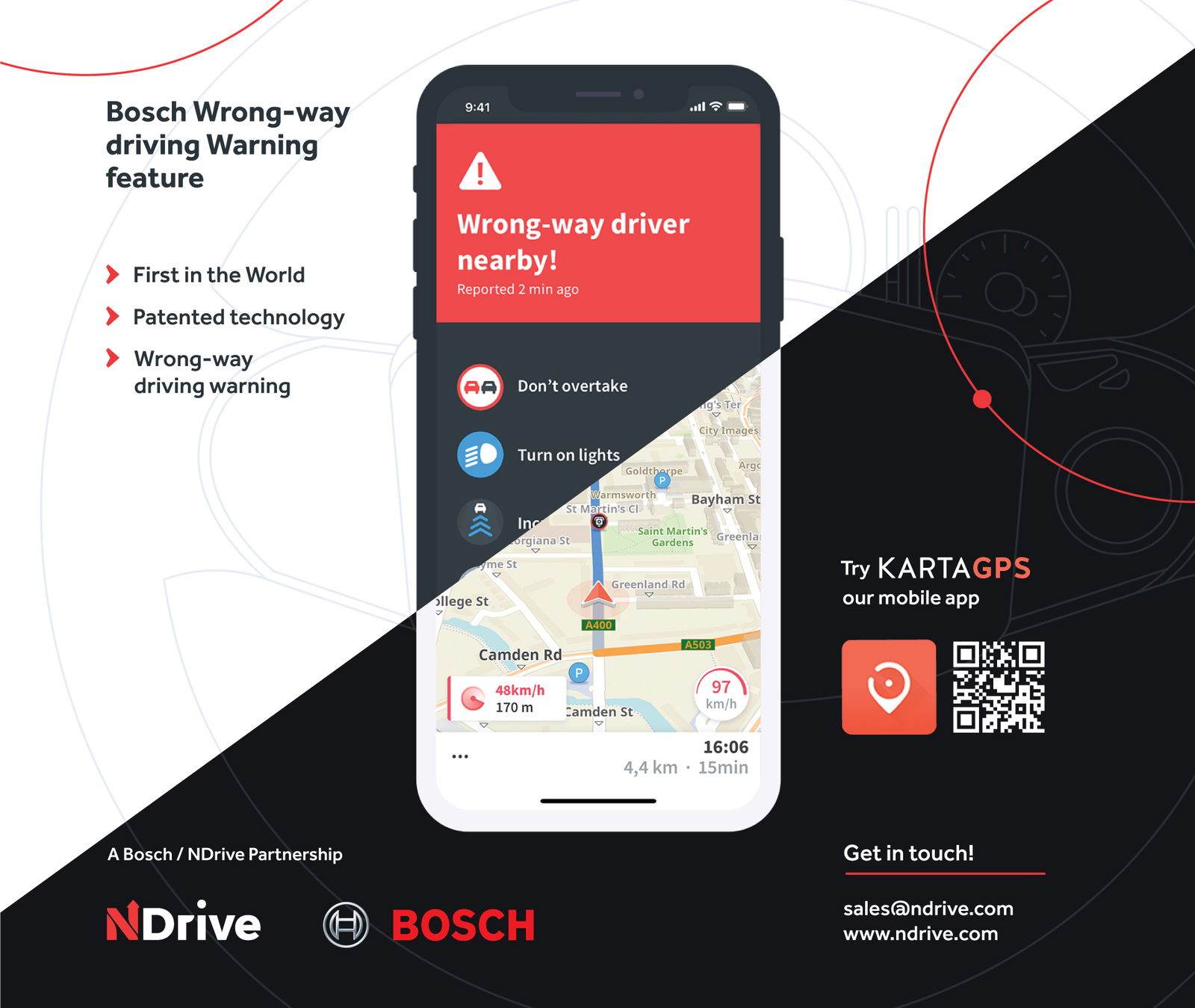 Installato su 15 applicazioni, tra cui la GPS Karta, tra le App più diffuse al mondo, il servizio in questione è in fase di sperimentazione in Germania ed è destinato ad allargare il suo bacino di utenza. Bosch è infatti in contatto con diverse case automobilistiche al fine di integrare il wrong-way driver warning come dotazione di serie.COME FUNZIONA