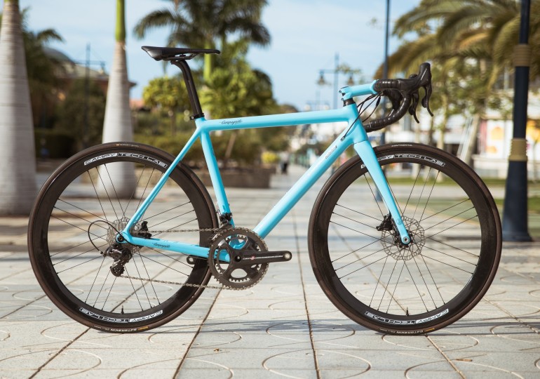 Shimano e Sram propongono da tempo soluzioni a disco per le bici da corsa, ma ora anche Campagnolo, più tradizionalista, si prepara a scendere in lizza in questo settore, forte dello sviluppo effettuato grazie al team professionistico Astana. Al momento viene mantenuto il più stretto riserbo sui dati tecnici del nuovo progetto, ma secondo rumors insistenti si tratterà di un sistema idraulico con rotori da 140 o 160 mm di diametro e pinze a doppio pistoncino. I componenti saranno disponibili per i gruppi sia meccanici sia elettronici e secondo gli standard di fissaggio Post-Mount o Flat-Mount, con sgancio rapido o perno passante.