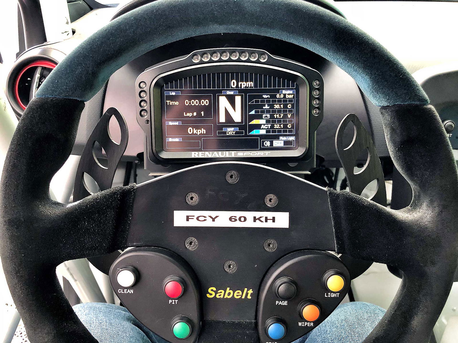 L’auto è ovviamente spogliata di tutto, cruscotto compreso rimpiazzato da un compattissimo cockpit digitale con tanto di led di cambiata che fa venire la bavetta appena sali in auto e non hai ancora nemmeno acceso il motore. Mentre la studio capisco che avevo preso la Clio un po’ alla leggera, pensavo di trovarmi al cospetto di un’auto di serie un po’ preparata ma non è così. La Clio Cup merita il massimo rispetto. Me lo fa capire ancor prima di entrare in pista quando parto dal box mollando la frizione come se fossi al parcheggio dell’Esselunga. Toco-toc! La frizione attacca in un millimetro la Clio fa un sobbalzo e il motore si spegne, mentre il meccanico che si prenderà cura di noi per tutto il we mi guarda con la faccia sconsolata del tipo “iniziamo bene, questo manco sa partire”. Ok, reset. Non siamo all’Esselunga siamo a fare una gara e questa è una macchina “vera”. Regoliamoci di conseguenza.