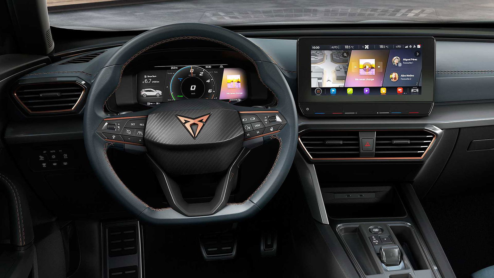 La posizione di guida della Cupra Formentor è stata volutamente avvicinata all’asfalto, mentre i raffinati sedili avvolgenti a guscio con schienale in carbonio si mischiano ad una plancia ricca di schermi: quello davanti al guidatore, che sostituisce la classica strumentazione, e quello al centro, naturalmente touch, da 10”. Il comunicato non ne parla, ma possiamo ipotizzare che la capacità del vano bagagli sia di tutto rispetto: vedremo a Ginevra.