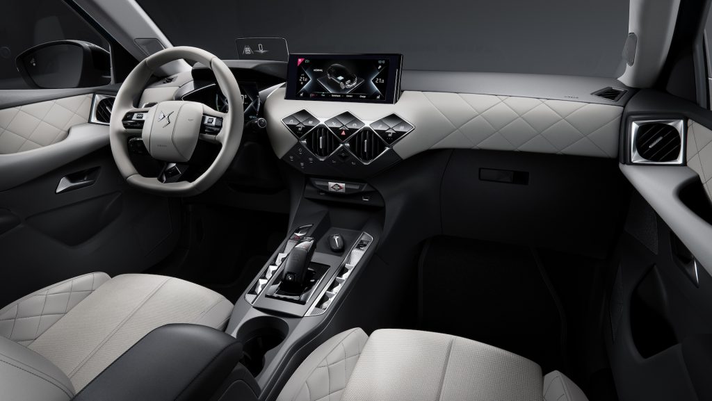 Torniamo alla nostra prova: DS3 Crossback E-Tense. L’anteriore regala un’impronta muscolosa al primo sguardo: abbastanza imponente rispetto alle dimensioni (lunghezza 412 cm, larghezza 179 cm e altezza 153 cm) tutto sommato compatte di questo B-SUV – qui i migliori SUV elettrici a meno di 30.000 € (con incentivi). La griglia dal profilo esagonale focalizza l’attenzione proprio al centro del logo DS, punto in cui convergono le linee di paraurti, cofano, luci diurne e gruppi ottici. Questi ultimi sono profondamente rinnovati nell’aspetto (i designer della Casa dicono di essersi ispirati alla gioielleria francese) e nella tecnologia (a matrice di LED).