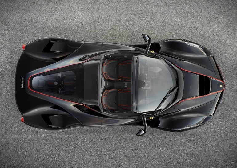 La variante a cielo aperto della supercar di Maranello sarà disponibile sia con un hard top in fibra di carbonio sia con un soft top in tela amovibili manualmente, così da contenere le masse alla luce dell’inevitabile aggravio ponderale legato all’irrigidimento della struttura portato in dote dalla configurazione open air. Al momento non sono state diffuse ulteriori informazioni, ma osservando attentamente la vettura si nota la presenza all’avantreno, in prossimità dei passaruota anteriori, d’inedite superfici aerodinamiche volte a garantire valori di deportanza da record anche in assenza del tetto. Per conoscere tutti i segreti della LaFerrari Aperta non resta che attendere il Salone di Parigi.