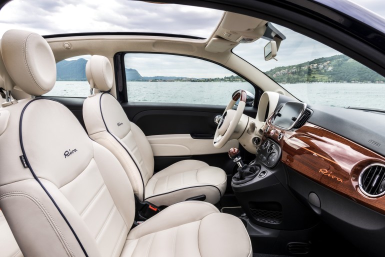Le caratteristiche distintive della 500 Riva sono salve. Non mancano, pertanto, la targhetta numerata personalizzabile con il nome della propria imbarcazione, la livrea (unica) Blu Sera – una delle colorazioni più apprezzate della gamma di yacht Aquariva Super – con la capote in tela blu, le calotte dei retrovisori laterali cromate, al pari delle maniglie delle portiere e della modanatura lungo il cofano, e un doppio tratto in tinta acquamarina lungo la linea di cintura della vettura. Specifico anche il design dei cerchi in lega da 16 pollici a venti razze, parzialmente blu, mentre il marchio del cantiere nautico lombardo è presente al retrotreno, in corrispondenza dei passaruota e lungo la plancia, oltre che sui poggiatesta dei sedili. L’esclusività, dopo lo scarso successo riscosso dalla’Aston Martin Cygnet, basata sull’utilitaria Toyota IQ, torna a sposare una city car.