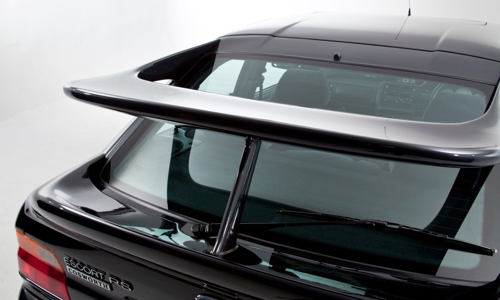 Se il frontale non è poi tanto diverso da quello di una Escort normale (tolto il paraurti specifico, le aperture sul cofano motore e la larghezza superiore), la RS Cosworth fa salire la pressione con i passaruota bombati che ospitano cerchi maggiorati e dal design dedicato. Quando poi arrivi dietro, fatichi a credere che l’abbiano fatto sul serio, e quasi ti commuovi, vorresti abbracciare chi è stato tanto “sfacciato” da proporre un’ala così grande – con tanto di “piloncino” centrale di supporto – e chi ha promosso l’idea.