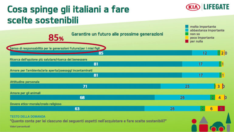 Il progetto in questione è nato analizzando i dati forniti dall’indagine ISTAT sul rapporto tra gli italiani e la sostenibilità, che ha messo in luce, tra le altre, che ciò che spinge gli italiani a compiere scelte ecosostenibili è fondamentalmente il senso di responsabilità nei confronti delle generazioni future.