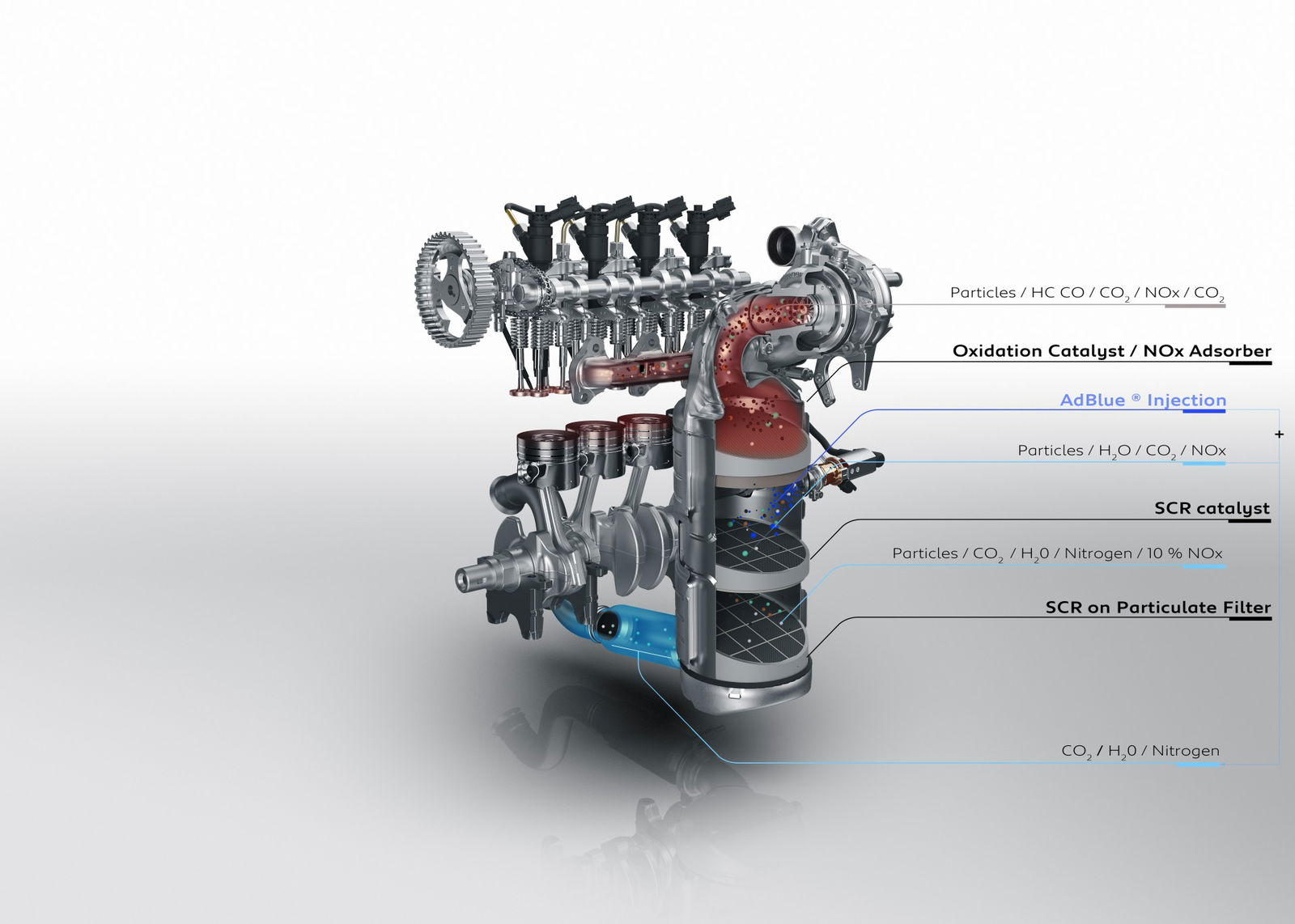 Per arrivare a questi risultati le mosse principali sono state il passaggio alle quattro valvole per cilindro, l’utilizzo di una pompa olio a cilindrata variabile e l’incremento della pressione del gasolio a 2.000 bar (curva di potenza più lineare e continua anche agli alti regimi); lo sviluppo di un nuovo sistema di combustione a geometria brevettata con camera inclinata, derivato dal Motorsport e l’aumento del ricircolo dei gas di scarico grazie a un maggiore raffreddamento (diminuzione dei consumi fino al 6%); il posizionamento della SCR sul FAP vicino al motore per un trattamento migliore dei NOx (riduzione del costo d’utilizzo attraverso l’eliminazione dell’additivo FAP).