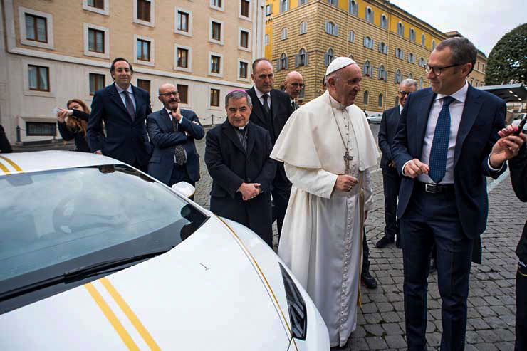 FAR CARRIERAPapa Francesco ha ritirato pochi giorni fa la sua nuova “auto aziendale”, una Lamborghini Huracan RWD (Rear Wheel Drive, trazione posteriore da 580 cv) con livrea speciale, uscita dallo stabilimento di Sant’Agata Bolognese. Il salto è notevole: a oggi, Francesco è sempre stato visto aggirarsi per i cortili vaticani a bordo di una timida Fiat Panda. Si abituerà? Crediamo di sì. E non è tutto: il centro stile ha realizzato per lui una speciale grafica papale, un mix di bianco panna e strisce giallo tiberino, colori che riprendono la bandiera della Città del Vaticano.La Lamborghini del PapaEcco la Lamborghini del Papa, consegnata al Santo Padre con una cerimonia a cui ha presenziato tutto il CdA Lamborghini, a partire dall’amministratore delegato Stefano Domenicali.Fermi lì con i commenti: haters e dietrologi devono sapere che la Lamborghini del Papa verrà battuta all’asta molto a breve da RM Sotheby’s, società d’aste di auto di valore, e il ricavato andrà interamente in beneficenza.