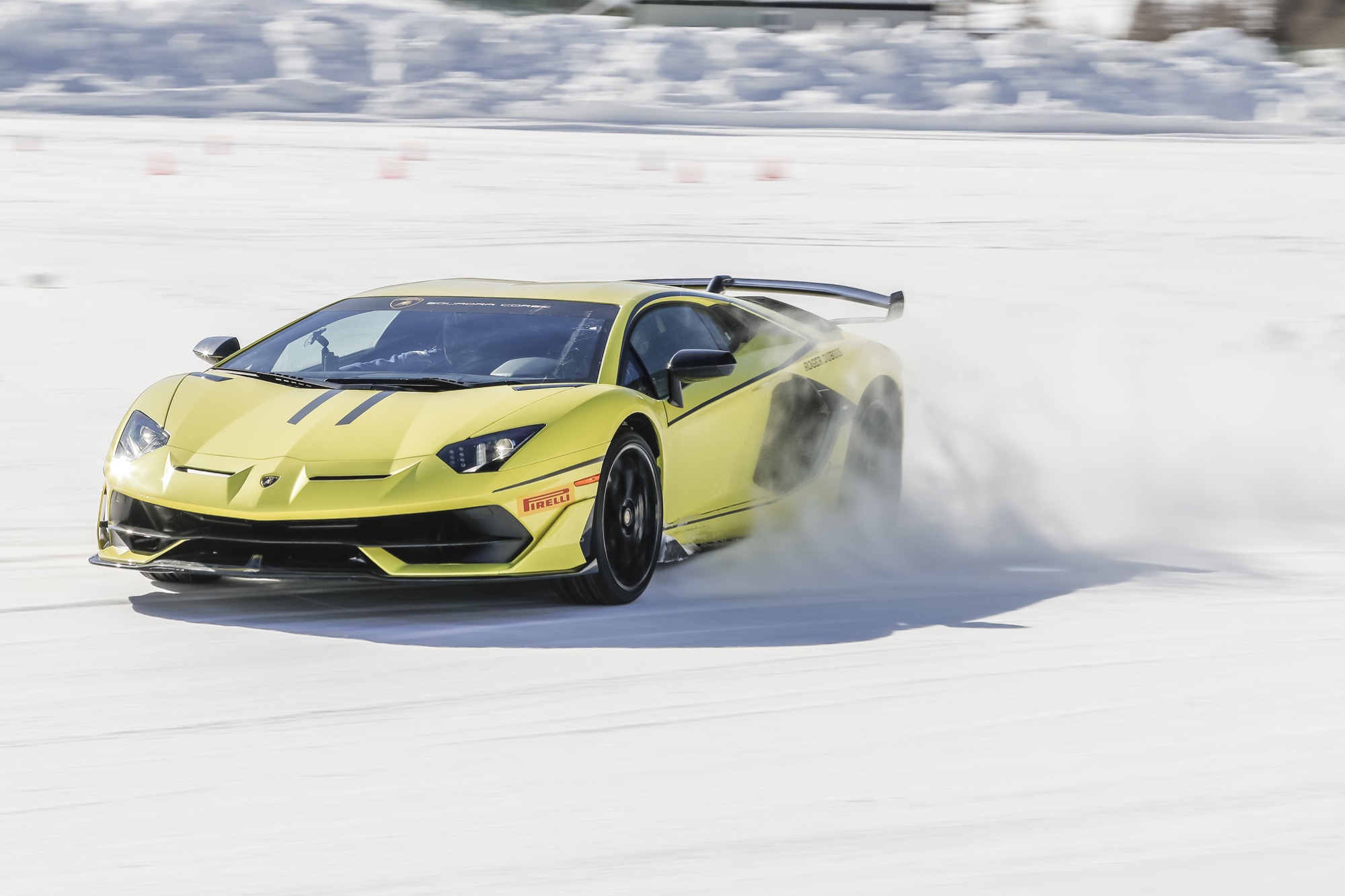 Lo fa anche quando il motore dietro la schiena diventa il V12 da 770 cavalli e 720 Nm della Aventador SVJ: qui l’aerodinamica attiva si chiama ALA 2.0 ed è in grado di ottenere deportanza elevata o, al contrario, bassa resistenza in base alle condizioni; flap attivi nella zona frontale e sul cofano motore indirizzano i flussi d’aria. Oltre allo sterzo dinamico, che si adatta a velocità e modalità di guida selezionate, la SVJ sfrutta le ruote posteriori sterzanti, che girano in senso opposto a quelle anteriori quando la velocità è bassa, nello stesso senso quando è alta, aiutando il pilota tra i muri di neve del ghiacciodromo di Livigno.