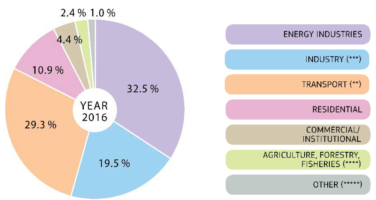 Numeri alla mano, guardiamo alle emissioni dei Gas Serra (GHG). Il grafico mostra come il settore dei trasporti ne sia responsabile per una quota pari al 29.3%.