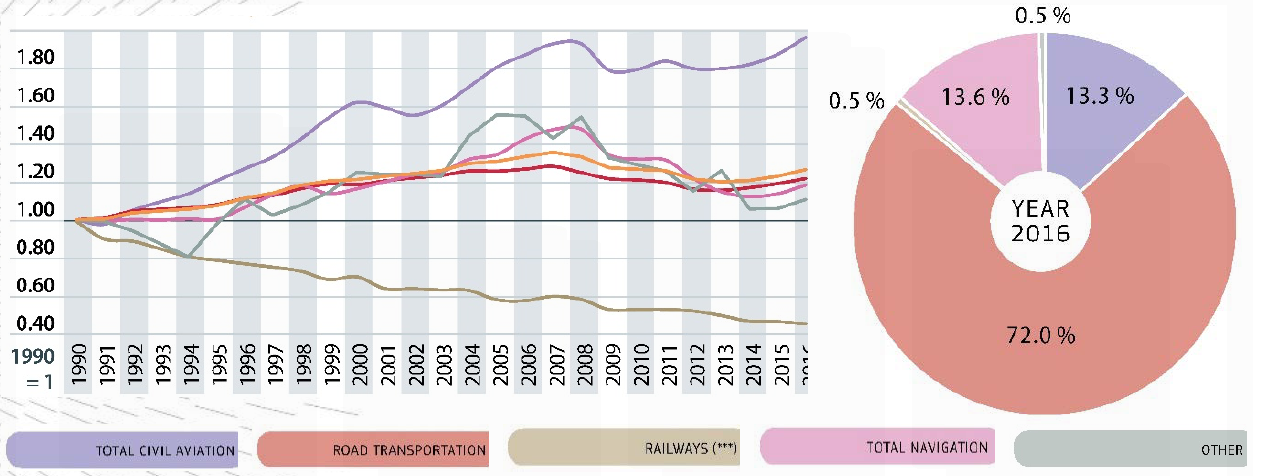 Di questa fetta, il trasporto su strada è responsabile per il 72%. Dagli anni ’90 ad oggi vi è stato un aumento pari al 20% (l’aumento delle vetture è stato bilanciato dal miglioramento tecnologico).