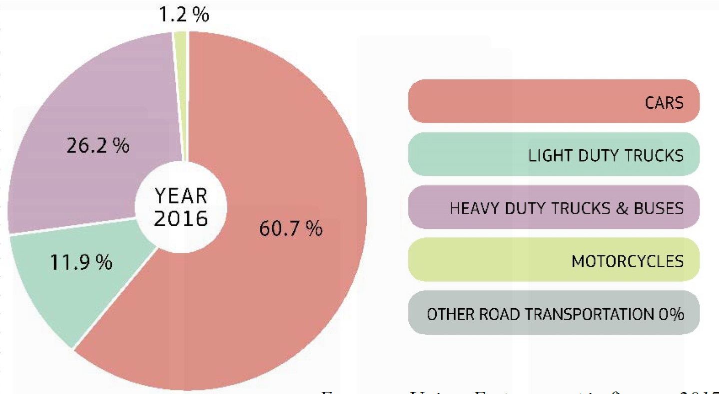 Scendiamo un gradino e svisceriamo il trasporto su strada. Le auto sono causa della fetta maggiore, pari al 60.7%. Ricapitolando, abbiamo che le auto Europee contribuiscono alle emissioni globali di GHC per circa l’1 %! Nonostante questo valore, le emissioni delle auto sono nel centro del mirino (gli obiettivi Europei sono i più ambiziosi a livello mondiale).