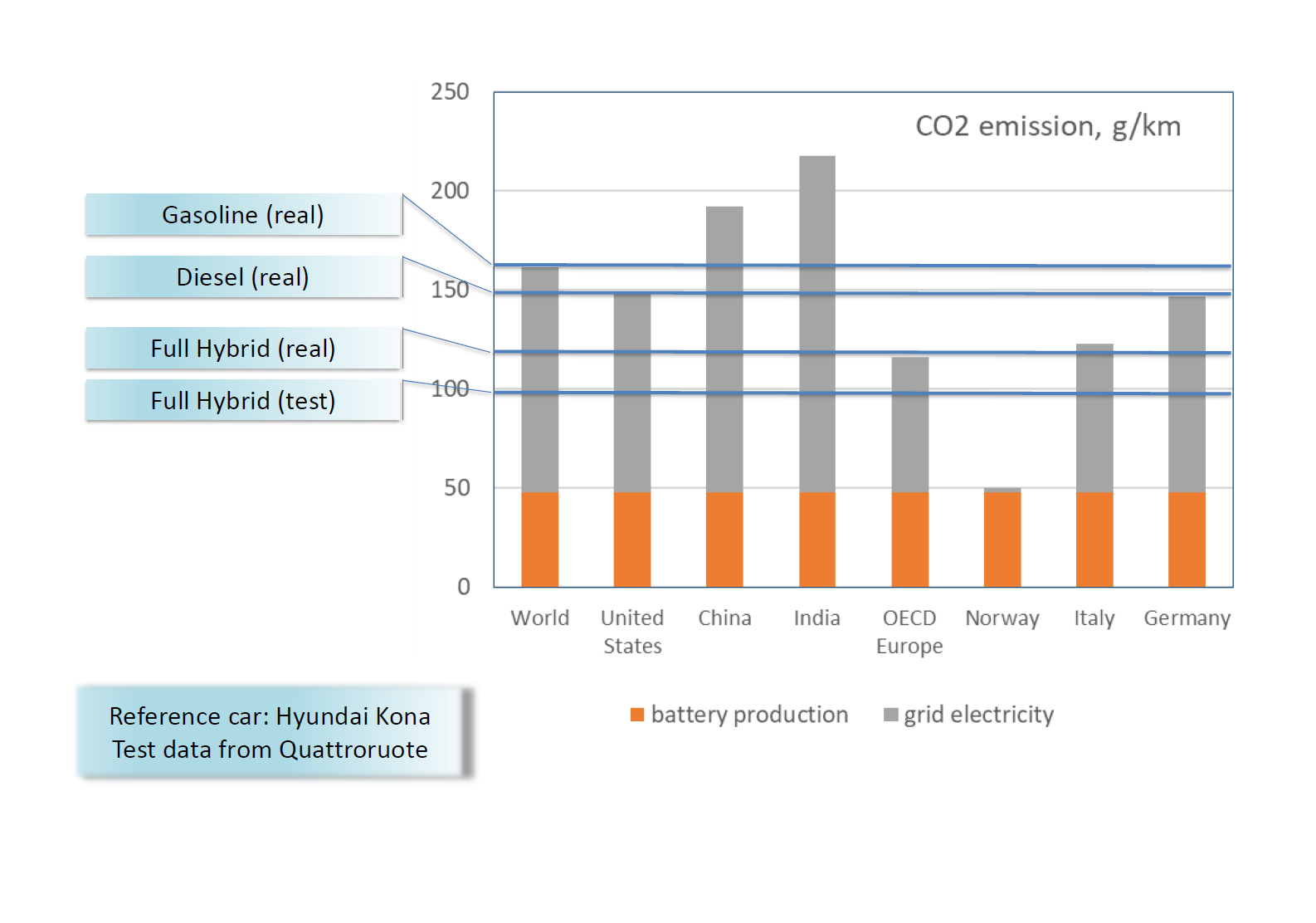 Diamo un occhio alla figura. L’istogramma riporta in arancione la CO2 emessa (g/km) durante la fase di produzione delle batterie mentre in grigio quella prodotta durante la ricarica. Si nota chiaramente la sproporzione tra un paese come la Norvegia (ampio utilizzo di fonti di energia rinnovabili) e uno come l’India (forte uso di Carbone). Il motivo è semplice e ve lo abbiamo anticipato poco sopra. I Paesi con parco di generazione basato sul Carbone sono caratterizzati da maggiore emissione di CO2. In sovraimpressione all’istogramma vengono riportati i dati di emissioni di CO2 della Hyundai Kona, vettura che viene venduta nelle varianti benzina, Diesel, ibrida ed elettrica. Si nota come, sempre dal punto di vista delle emissioni di CO2, la tecnologia elettrica porti reale vantaggio solo in paesi come la Norvegia. In paesi come Cina ed India benzina e Diesel risultano addirittura migliori!