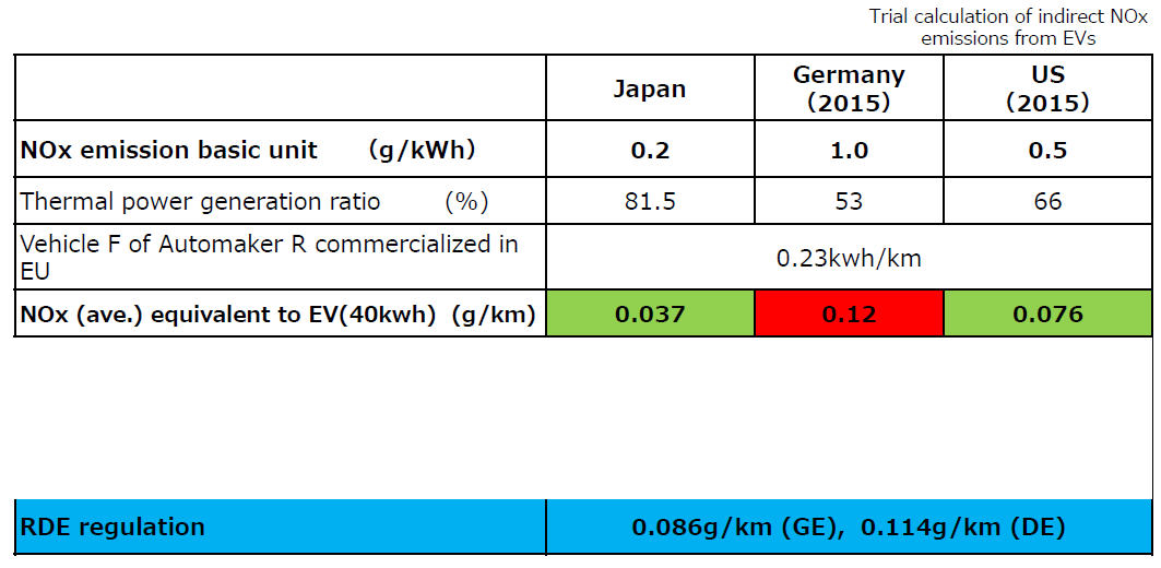 L’ingegnere di Mazda ci chiede, dopo quanto mostrato, se siamo convinti che le auto elettriche siano veicoli a zero emissioni. Dopo l’analisi sulla CO2, batte sul ferro caldo proponendoci un ulteriore studio relativo alle emissioni di PM e NOx. Ci mostra innanzitutto le emissioni di particolato a Tokyo. Il 7 % del totale deriva dalle emissioni di veicoli con motore a combustione interna mentre il 24% proviene da gomme e freni. Questa quota parte legata all’usura caratterizza ovviamente anche i veicoli elettrici. Per quanto riguarda invece gli NOx, Hitomi parte evidenziando le emissioni legate alla produzione di energia elettrica con la tecnologia termoelettrica. I valori sono riportati alla prima riga della tabella qui sotto (NOx emission basic unit).