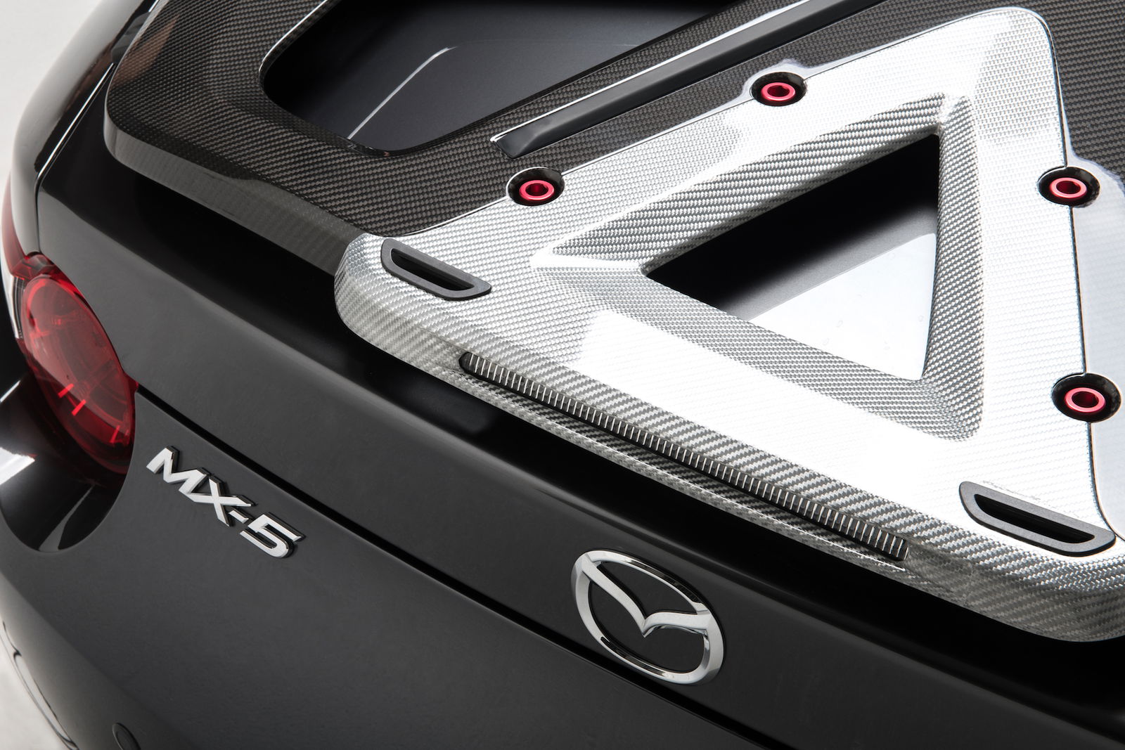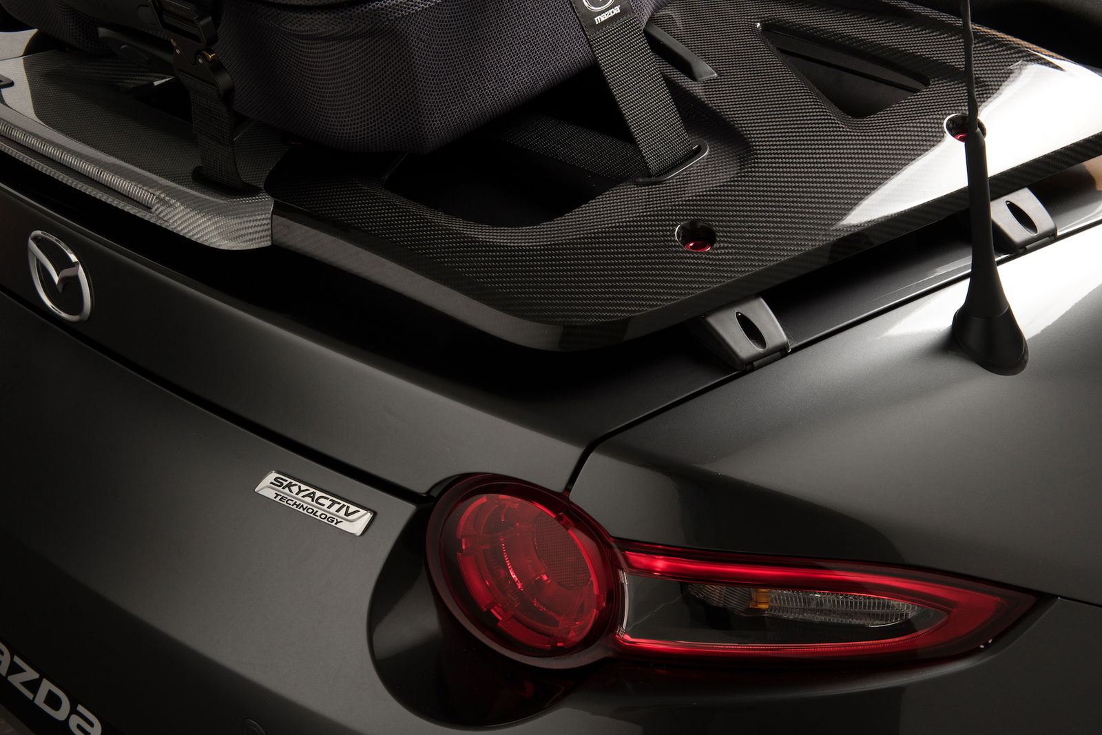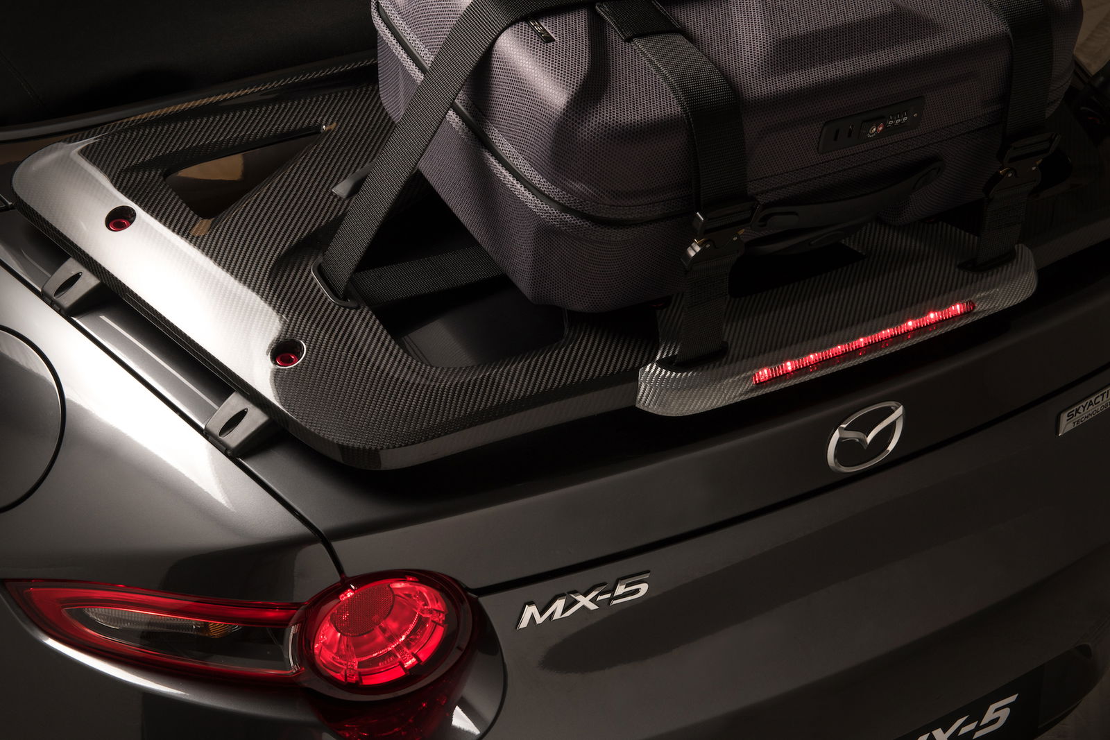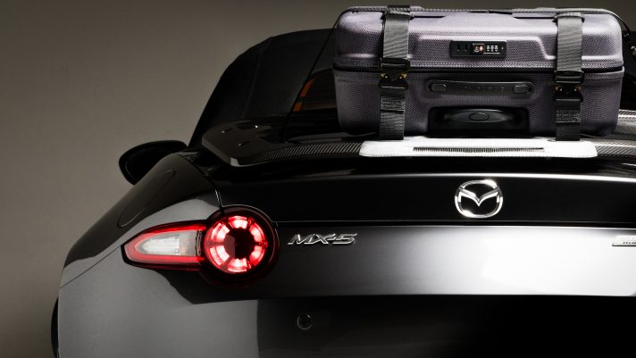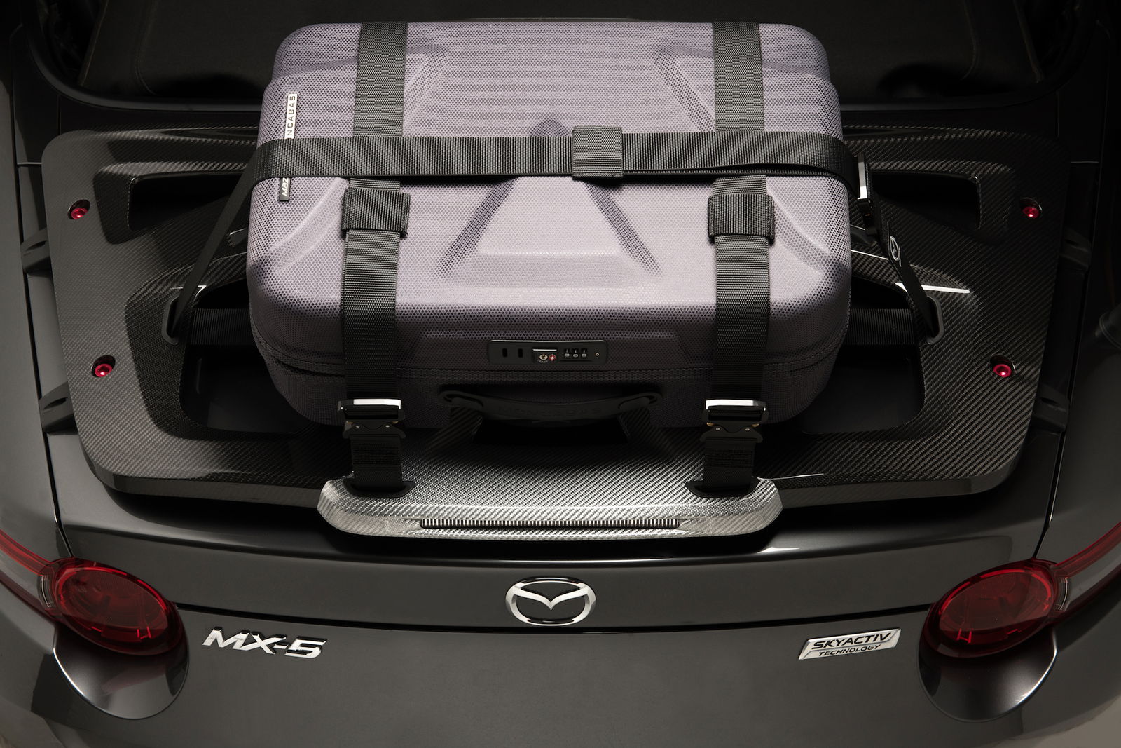 Per un trolley in piùSe sui vecchi modelli NA ed NB era possibile caricare bagagli in eccesso su un opzionale portapacchi cromato, da installare sopra al baule, per questa Mazda MX-5 Grand Tour ad Hiroshima si sono superati. Realizzando un elegante portapacchi in fibra di carbonio su misura, dotato di terza luce stop e capace di ospitare una valigia dedicata, prodotta da Moncabas su specifiche Mazda. A risentirne, probabilmente, solo la visibilità posteriore: la visuale dallo specchietto centrale sembra quasi totalmente occupata dalla pregiata borsa rigida.