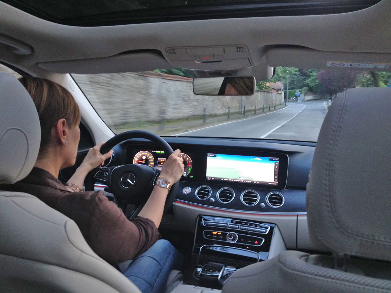 Classe E 350e Nel breve tragitto compiuto nel Parco della Villa Reale e sulle strade limitrofe abbiamo subìto (per la prima volta) il grande fascino dell’ammiraglia, ricca di elementi che enfatizzano il comfort e la tecnologia. Avevamo a disposizione il pacchetto di assistenza alla guida in versione plus e un cockpit completamente digitale, con doppio display in alta risoluzione da 12.3”, quello sinistro dedicato al quadro strumenti con tre modalità di visualizzazione. La variante ibrida plug-in concede fino a 33 km in modalità elettrica (e silenziosa) a una velocità massima di 130 km/h, la berlina si fa ovviamente “sentire” in modo più marcato quando entra in funzione il motore termico.