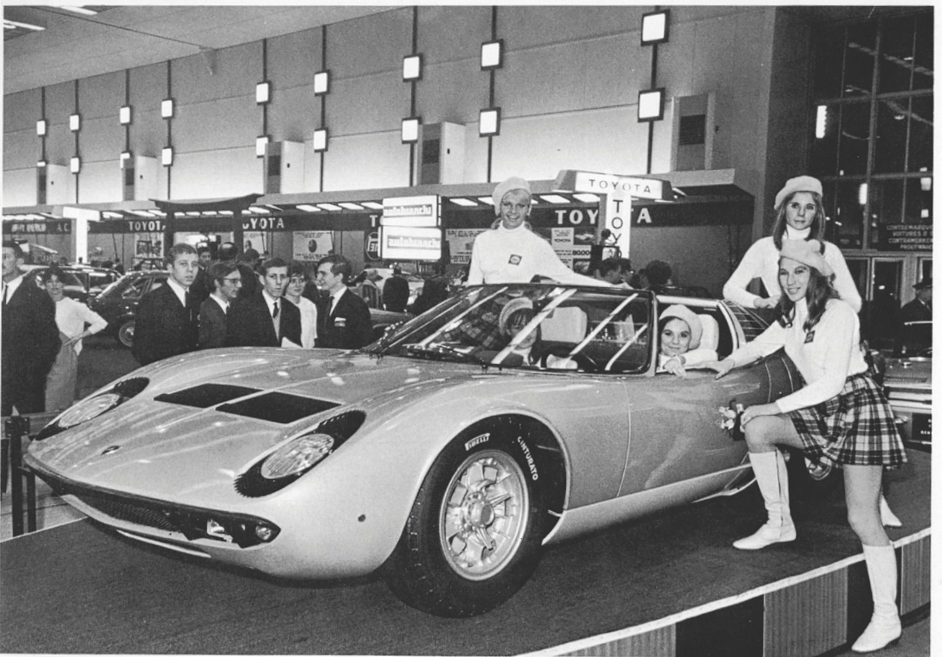 Nasce così il progetto denominato 400 TP. Il motore è rigorosamente il 12 cilindri 4 litri della 400 GT, messo in posizione trasversale dietro l’abitacolo insieme al cambio: il blocco, insieme anche al differenziale, è in un’unica fusione. Quanto al telaio, è realizzato in lamiera piegata, saldata e forata per ridurne il peso. Quanto basta per far innamorare Ferruccio Lamborghini al primo sguardo. Da lì al disco verde per la produzione, il passo è brevissimo. Così breve che persino Dallara e Stanzani rimangono stupiti. Se Dallara e Stanzani rappresentano il meglio dal punto di vista tecnico, fra i designer il nome di Marcello Gandini (che all’epoca lavora alla Carrozzeria Bertone) è uno fra quelli di spicco. E a chi si affida Lamborghini per disegnare la sua supersportiva? A Gandini, ovviamente. Al Salone dell’Automobile di Ginevra del 1966 il mondo si arricchisce della Miura e la foto qui sotto è proprio di quel Salone.