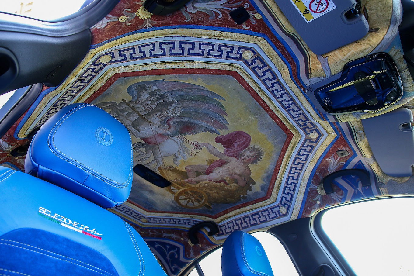 Salta subito all’occhio la personalizzazione di Garage Italia Customs: “direttamente” dal periodo rinascimentale troviamo una riproduzione di un’opera dei fratelli Zuccari, basta accomodarsi all’interno di Alfa Romeo Giulia Grand Tour ed alzare lo sguardo.