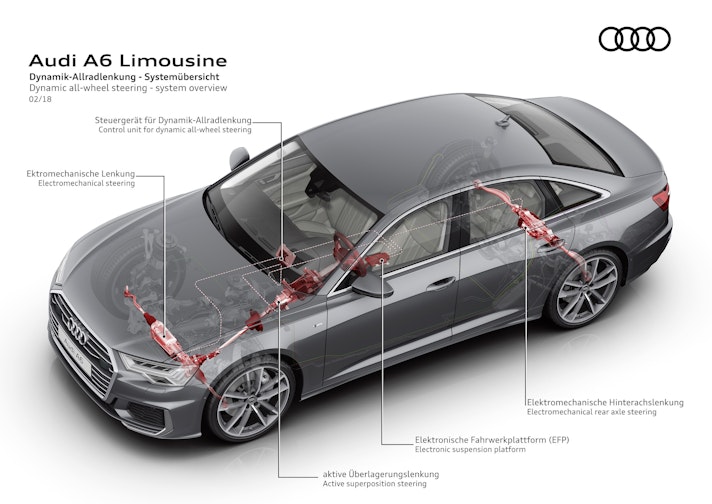 STERZO INTEGRALETutte le nuove Audi A6 dispongono dello sterzo a rapporto variabile, che diventa più diretto all’aumentare dell’angolo di sterzata. A richiesta è possibile montare lo sterzo integrale dinamico, con un rapporto di demoltiplicazione variabile tra 9,5:1 e 16,5:1 in funzione della velocità. Non vanno dimenticate le ruote posteriori sterzanti: alle basse velocità sterzano in direzione opposta, alle alte velocità in fase, per migliorare la stabilità. Infine i sistemi di sicurezza: grazie allo scanner laser, dodici sensori a ultrasuoni, cinque radar e altrettante telecamere, la nuova Audi A6 è in grado di ottenere un’immagine nitida di ciò che accade intorno. Il guidatore può contare su cruise control adattivo con sistema di mantenimento della corsia, Park Pilot, Garage Pilot e un innovativo sistema di assistenza agli incroci.