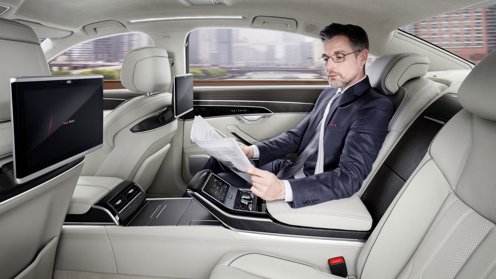Doppio display touchLe tradizioni sono importanti. L’innovazione, per l’A8, anche di più. Ecco perché la plancia dell’ammiraglia tedesca non è assimilabile a nessun altro modello di Ingolstadt. Al volante multifunzione a quattro razze si affianca l’inedita console corredata di un doppio touchscreen: il display superiore da 10,1 pollici dedicato all’infotainment, lo schermo inferiore da 8,6 pollici chiamato a sostituire i comandi fisici della climatizzazione, della gestione dei sedili e dell’immissione degli input per il navigatore. Una tecnologia compatibile con i movimenti swipe e il linguaggio naturale. E la “classica” interfaccia MMI Touch con il touchpad a ridosso della console? Pensionata. Non meno rivoluzionaria l’integrazione nel pacchetto Audi Connect con connettività LTE del sistema car-to-X per il dialogo della vettura con le infrastrutture e le altre auto, mentre la strumentazione integralmente digitale con pannello da 12,3 pollici – una dotazione ormai diffusa nella gamma Audi – si avvale della grafica HD con risoluzione 1920×720 pixel. Anche in questo caso, l’A8 è pioniere dell’hi-tech.Guida autonoma di Livello 3Sono ben 41 i dispositivi di assistenza alla guida disponibili. Un record. Oltre che un primato alla base del Livello 3 di guida autonoma, condizione nella quale il veicolo è in grado di procedere autonomamente, senza intervento umano, lungo tratti stradali mediamente controllati come le autostrade. La tecnologia, in questo caso, deve essere attivata espressamente dal guidatore e necessita di costante attenzione. Un orizzonte reso possibile dall’AI, l’Intelligenza Artificiale Audi, che abbinata al sistema Traffic Jam Pilot consente alla vettura di viaggiare senza interventi del conducente sino a 60 km/h nel traffico autostradale. Acceleratore, freno e sterzo sono affidati al computer attraverso l’interfaccia ZFas che ricostruisce un’immagine di ciò che circonda il veicolo, interfacciando i dati raccolti dalla telecamera frontale, dal radar, dai sensori a ultrasuoni e dallo scanner Laser. Il guidatore può staccare le mani dal volante ma solo sino a quando il veicolo richiede un intervento. In assenza di feedback l’auto si ferma nel primo spazio disponibile.