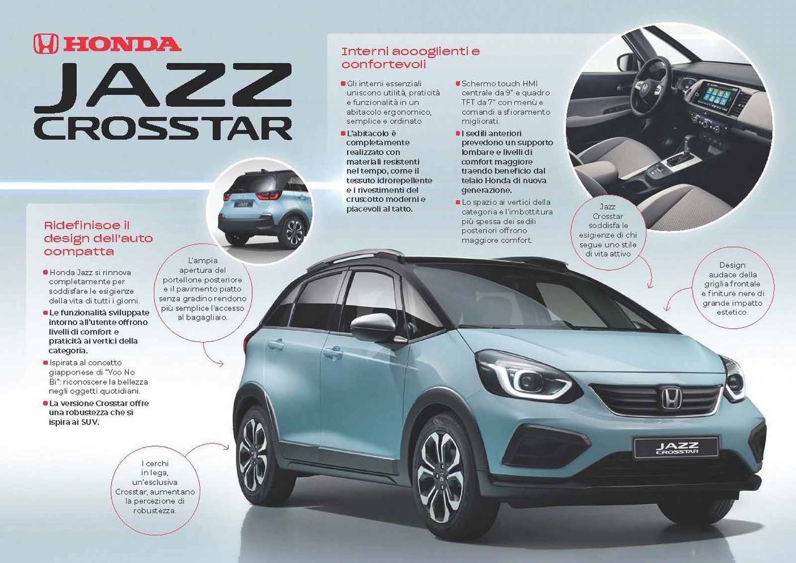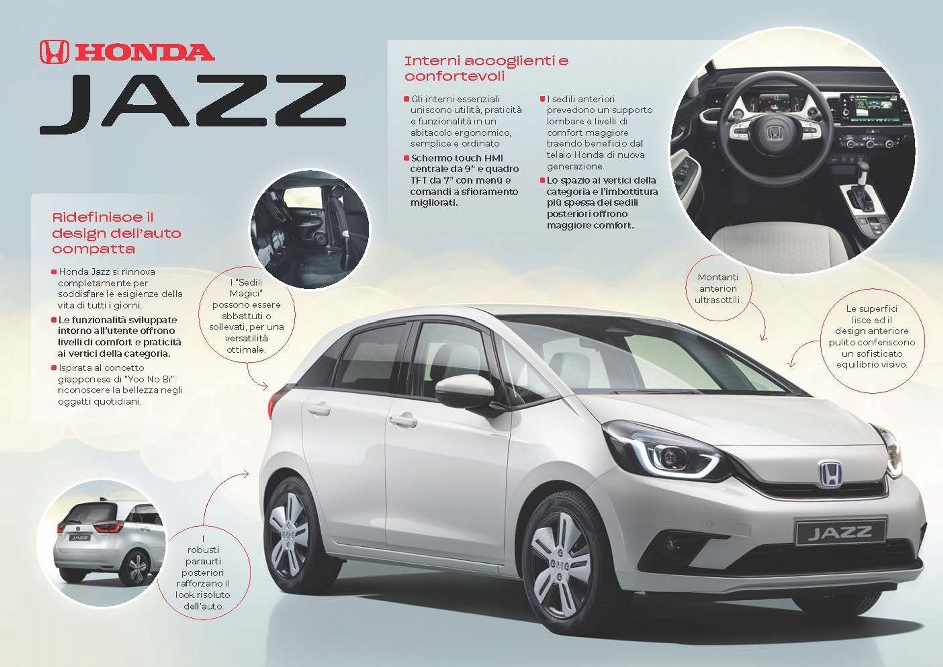 Jazz conserva il pavimento piatto, per includere nel retro i suoi pratici “Sedili Magici”. Questa configurazione permette di abbattere o sollevare i sedili in posizione verticale, offrendo una versatilità ottimale per accogliere carichi di varie forme e dimensioni; inoltre, grazie a un’apertura più ampia del portellone posteriore e al nuovo pavimento piatto senza gradino, il carico e lo scarico diventano di estrema facilità.La nuova Jazz, disponibile in Europa a partire dalla prossima estate, sarà il simbolo dell’impegno di Honda a estendere la tecnologia elettrificata per tutti i suoi principali modelli europei entro il 2022.