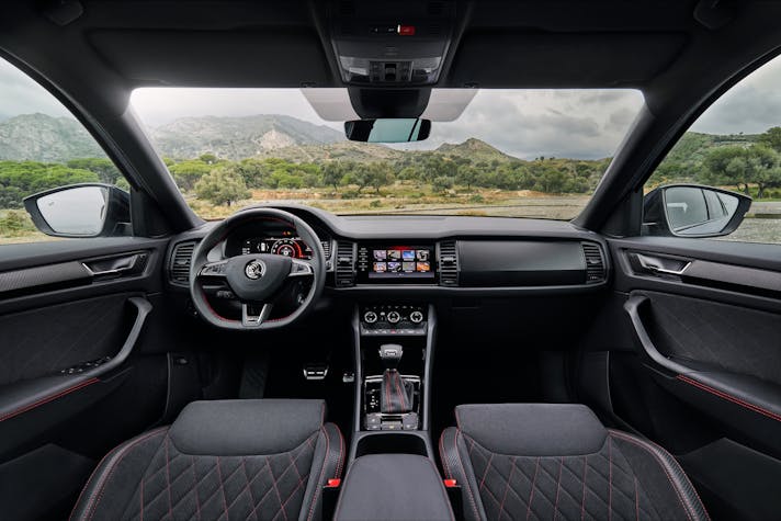 Dotazione riccaAll’interno della Skoda Kodiaq RS spicca la strumentazione Virtual Cockpit, di serie, che aggiunge una modalità di visualizzazione sportiva. Ordinabile anche in versione 7 posti, la grande SUV boema è ben dotata anche dal punto di vista della sicurezza. Di serie ci sono cruise control adattivo, riconoscimento stanchezza conducente e Front Assistant con riconoscimento pedoni. Fra gli altri, non mancano il navigatore, la connettività Apple CarPlay e Android Auto e il sistema Keyless.