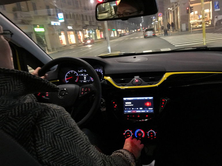 Molto graditi i numerosi servizi che rientrano nella voce “assistenza alla guida”, merito del sistema Opel Eye. A partire dalla tecnologia di allerta dell’angolo cieco, che tiene sotto controllo le corsie laterali e, se si sta cambiando carreggiata, attiva un segnale luminoso nello specchietto nel caso rilevi un veicolo in avvicinamento.Di grande utilità anche il sistema di segnalazione dei segnali stradali, ingresso/uscita dall’autostrada, divieti di sorpasso, limiti di velocità… che si incontrano nel tragitto, catturati da una videocamera anteriore.Parcheggio per uno spuntino di mezzanotte dal re della porchetta di Porta Genova. Cervicale al bando e… niente più scuse. La più incapace nelle manovre potrà solo fare bella figura. Si guarda dritto nel monitor per entrare e uscire dal parcheggio. Tutto lì. In questi frangenti si attiva un sistema di aiuto al parcheggio dotato di videocamera a colori, che rimanda attraverso lo schermo da 7” immagini nitide e immediate dello spazio dietro l’auto, nel raggio di 1,5 metri.Continuando la rassegna di ciò che si trova sulla plancia: la strumentazione è forse più leggibile con il calare delle tenebre, quando è illuminata. Il sistema di infotainment IntelliLink, invece, si connette in maniera intuitiva con i dispositivi iOS e Android dei nostri smartphone. Ovviamente ne ho subito approfittato per fare qualche telefonata “rosicona” agli amici direttamente dal sedile della Corsa…Gli interni? In tessuto Sunbeam con modanature gialle, hanno finiture accurate. Il volante è arricchito dai comandi radio integrati ed è realizzato in pelle, come il freno a mano e il cambio, questi ultimi due impreziositi da impunture gialle. Moooolto cool.