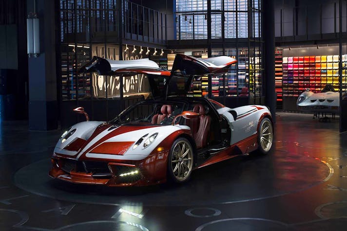 Si è partiti dalla carrozzeria: gran parte del Carbotitanio -materiale innovativo ideato da Pagani proprio per la Huayra – è rimasto in bella vista e anzi è stato lavorato per aumentarne la brillantezza anche sotto la vernice trasparente usata per il bianco e il rosso, in omaggio alla livrea della Turbina.Dai convogliatori laterali parte il Tricolore italiano, tre lampi che seguono l’andamento della fiancata fino ai gruppi ottici posteriori. Gli interni sono rivestiti di pelle a trama tridimensionale, tratta dagli artigiani di Foglizzo, mentre la mascherina frontale è stata ridisegnata per aumentare la portata d’aria. Le ruote e le pinze dei freni sono color oro, proprio come sulla Fiat Turbina. Il prezzo? Ovviamente top secret, ma indubbiamente elitario.