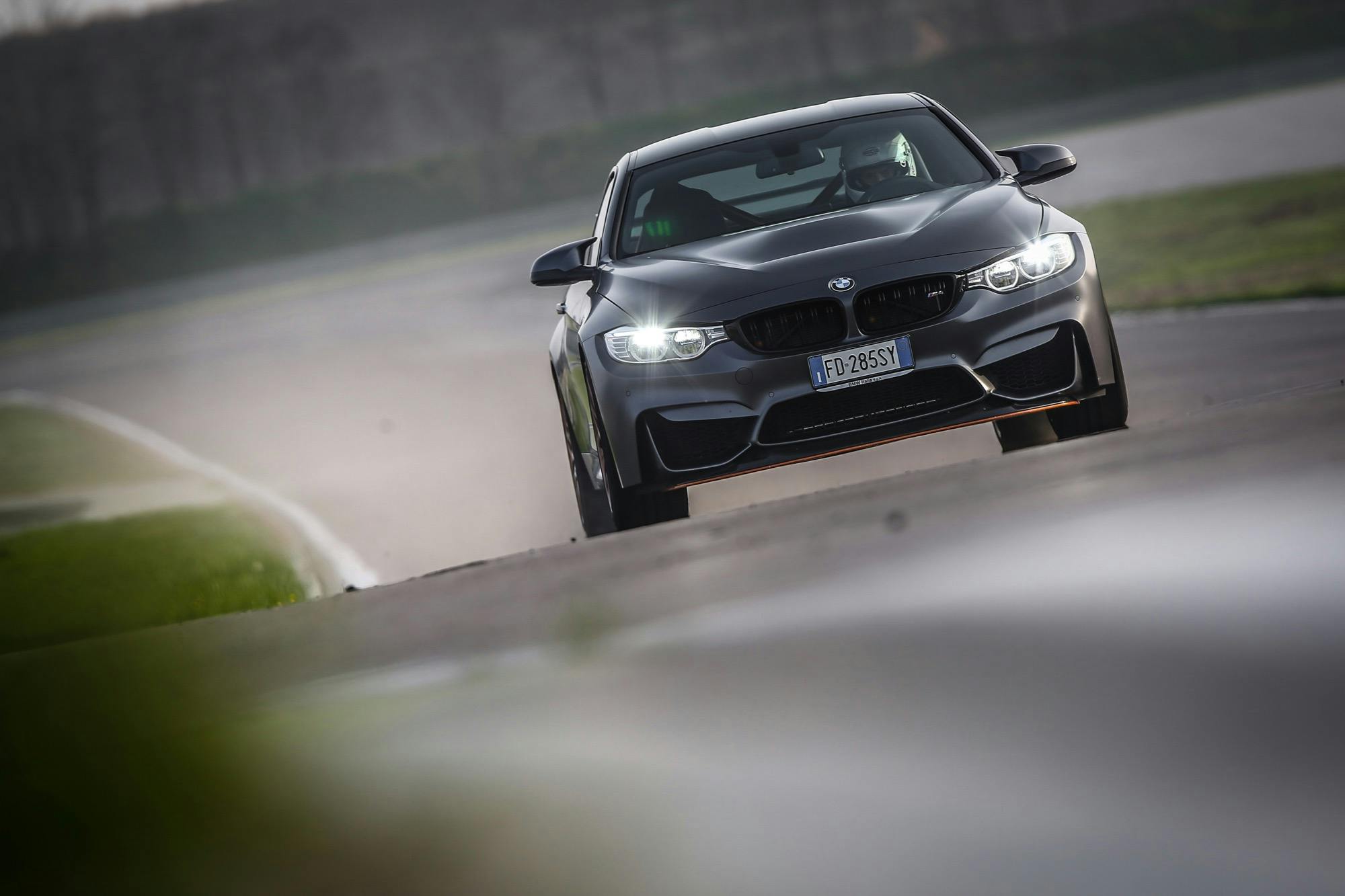 Non serve il cronometro.La BMW M4 GTS, a dispetto della teorica configurazione stradale delle sospensioni, vanta un set up che funziona bene tra i cordoli. Si accuccia appena in frenata, quel tanto che serve per avere carico all’avantreno, buona direzionalità dei pneumatici anteriori e grip quando si divorano le superfici seghettate dei cordoli. In questo frangente le Michelin Pilot Sport Cup 2 nelle misure 265/36 19 anteriore e 285/30 20 posteriore hanno il loro bel da fare per tentare (invano) di tenere le ruote allineate. Il retrotreno si alleggerisce in rilascio ed è pronto a partire con decisione non appena si punta il gas. Se il contagiri in quel frangente scavalca i 4.000 giri preparatevi a una bella scarica di adrenalina. Il messaggio è diretto, chiaro. Il posteriore pattina e parte deciso perché sul battistrada viene vomitata coppia da stordire. Eppure correggere di sterzo senza alleggerire la pressione sul pedale dell’acceleratore dopo pochi giri è routine.Mangia chicane.La BMW M4 GTS è veloce nei trasferimenti di carico e non soffre le spinte laterali. Si inserisce in curva, cerca e trova facilmente la corda. E replica nei cambi di direzione con generosità, regalando a chi guida sensazioni uniche anche a velocità contenute e con il motore che non urla a 7.000 giri. Pur trattandosi di una coupé il peso è stato asciugato, con una dieta ferrea, fino a 1.500 kg a secco: così l’auto si muove piuttosto bene anche quando ci sono da traguardare punti di corda insidiosi, con il pedale del freno pestato con decisione. Peccato che l’impianto frenante, benché equipaggiato di dischi carboceramici, fatichi a tenere il passo che telaio, motore e pneumatici permetterebbero. La frenata si fa meno decisa dopo alcuni giri, senza perdere modulabilità ma un pizzico di mordente nella fase di attacco delle pastiglie ai dischi.