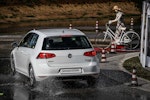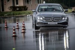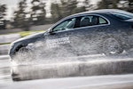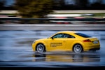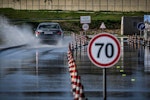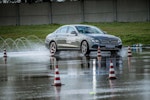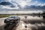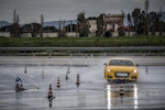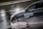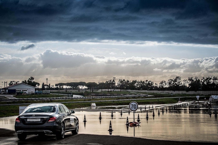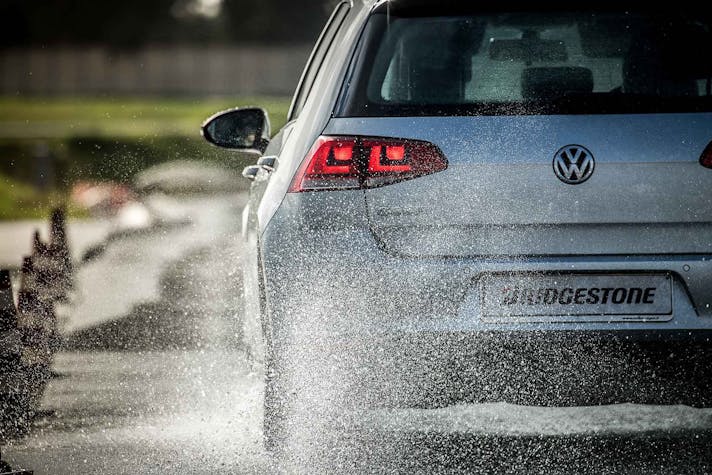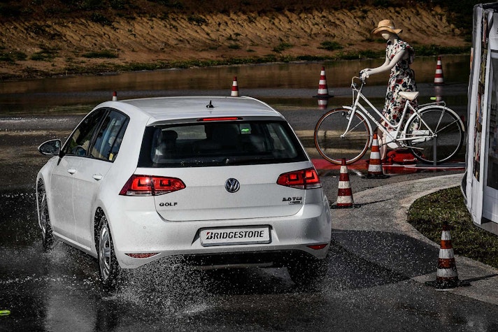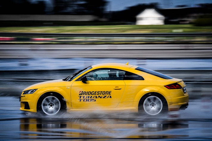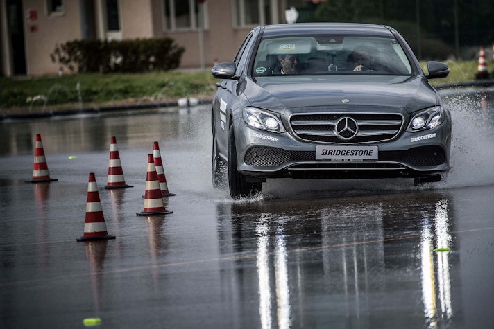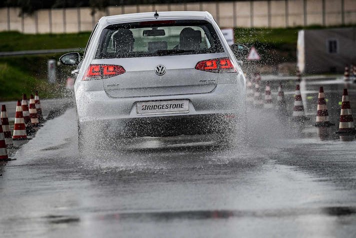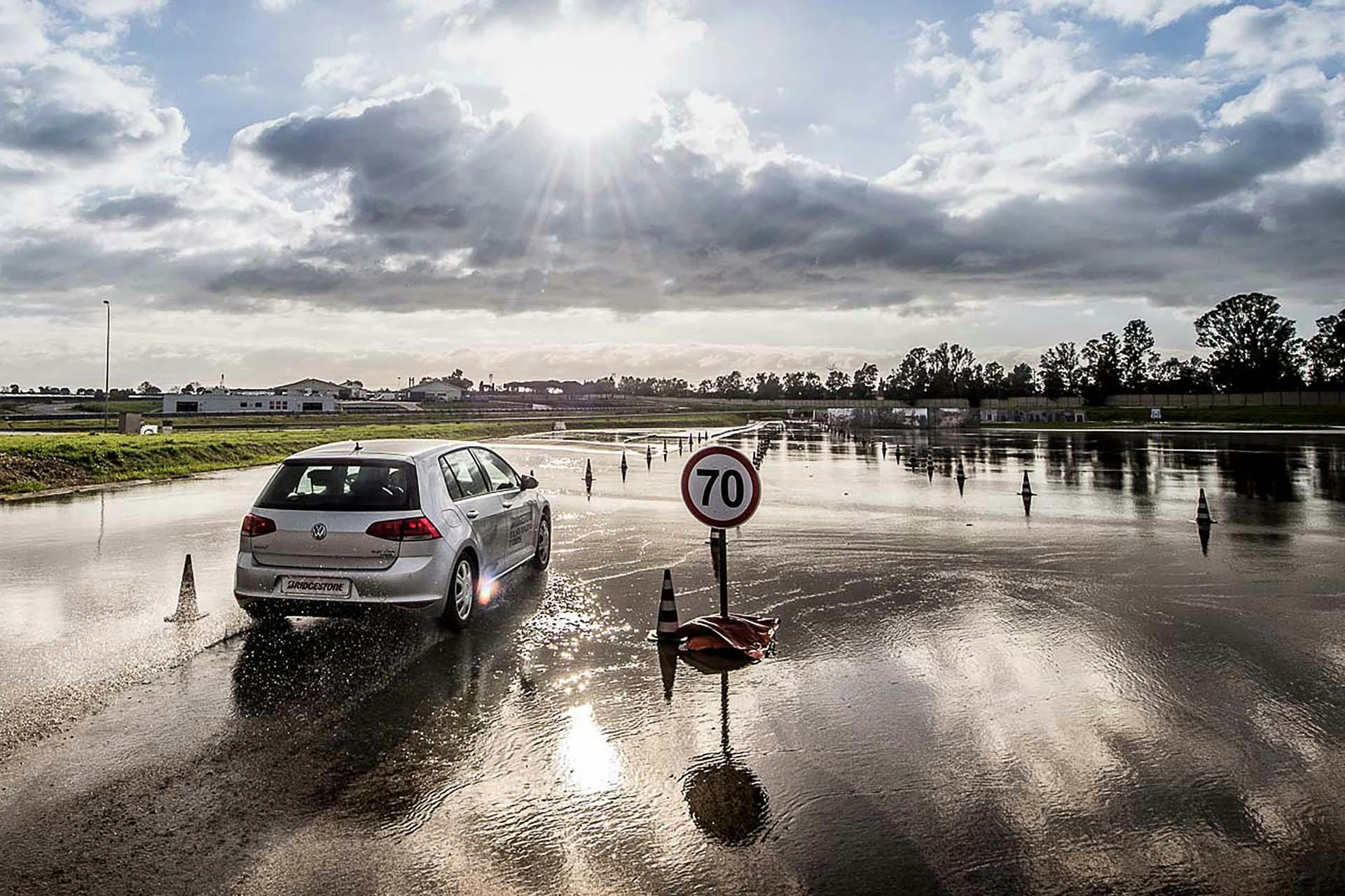 Come fare per mettere alla prova le prestazioni del Turanza T005 in tutta sicurezza? Bridgestone ha pensato fosse il caso di portarci all’interno del suo centro di collaudo ad Aprilia (in provincia di Latina), un agglomerato di piste adatte a ogni genere di test, dall’handling più stressante al banking ad altissima velocità (oltre 250 km/h). Un luogo affascinante e sterminato, realizzato appositamente per portare al limite fisico i pneumatici.SOLO TURANZATutte le auto in prova sono state equipaggiate esclusivamente con Bridgestone Turanza T005. Nel primo test, una Volkswagen Golf è parcheggiata sulla linea di start di un percorso a birilli. Il mini-circuito, ricavato su una piatta distesa di asfalto, è innaffiato costantemente da piccoli getti d’acqua, per simulare la guida sotto la pioggia. Ci siamo: partenza, i 70 km/h arrivano in fretta ed entriamo in una pozza artificiale, per simulare l’effetto aquaplaning. Il Turanza T005 si comporta bene: la Golf scivola per pochi istanti ma ogni pochi metri i pneumatici scavano e trovano grip. Dal volante arriva una bella sensazione di sicurezza, segno che gli intagli così pronunciati fanno il loro lavoro.ANCHE IN CURVACurva cieca, riduciamo sensibilmente la velocità (circa 40 km/h), un ostacolo improvviso ci obbliga a un panic stop a ruote sterzate. La Golf “smusa” ma gli pneumatici mordono l’asfalto, infischiandosene dei millimetri d’acqua e si ferma prima del fantomatico ostacolo. Meraviglia. L’esito è stupefacente anche in altre due situazioni, ovvero il curvone bagnato in appoggio (simula l’ingresso in autostrada) e la frenata sul dritto: gli spazi in cui la Golf riesce a fermarsi sono realmente ridotti, simili a quanto avrebbe potuto fare sull’asciutto.GIRA GIRAL’ultimo esercizio della giornata è lo skid pad. Per chi non è pratico, è un test per calcolare l’accelerazione laterale che l’auto (con i suoi pneumatici) è in grado di generare. L’auto viaggia su circonferenze di diametro noto (non più di 100 m) alla velocità più alta possibile prima che avvenga lo slittamento. Il gigantesco cerchio è a basso attrito: è innaffiato da secchiate d’acqua. Risultato: a bordo di un’Audi TT, la sensazione è di avere sempre un buon controllo della situazione. Il sottosterzo arriva più tardi di quanto ci si possa aspettare (e tenendo conto che è un pneumatico turistico!) e la TT non ha reazioni nervose o improvvise. Tutto è molto intuitivo e qualche istante a gas chiuso è sufficiente per ritrovare il grip perduto.