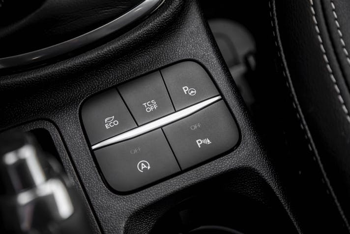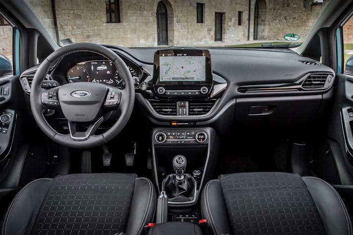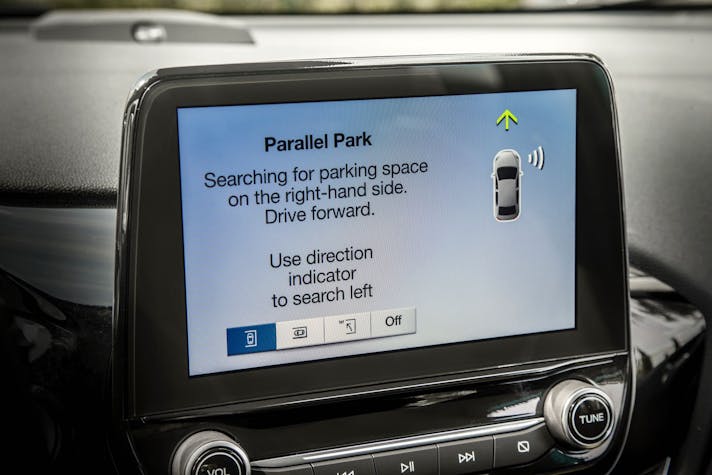 La plancia della Ford Fiesta my 2018 ha un look moderno e più pulito che in passato, con l’eliminazione di molti pulsanti. Numerosi comandi sono accentrati nel touchscreen centrale del sistema SYNC 3, che può essere da 6,5 oppure 8 pollici. L’infotainment è compatibile Glympse, Aupeo, Spotify e AccuWeather. Il SYNC 3 rappresenta la proverbiale punta dell’icebrg della tecnologia imbarcata a bordo della Fiesta, che adotta vari dispositivi di norma appannaggio di auto di categoria superiore. L’esempio viene dal Cross Traffic Alert, che segnala il sopraggiungere di altri mezzi mentre si manovra in retromarcia per uscire da un parcheggio a pettine, ma ci sono anche il cruise control adattivo, il monitoraggio dell’angolo cieco e i sistemi che vigilano sui colpi di sonno e sui salti di corsia involontari, giusto per fare qualche esempio.