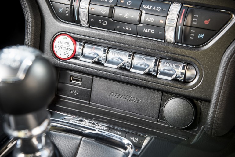 Lo sterzo? Essendo una vettura americana, avrà la precisione del timone d’una petroliera e la servoassistenza d’un sollevatore telescopico. Buono in parcheggio, preciso come una stilografica nelle mani d’un malato di Parkinson. Nulla di più falso. Luoghi comuni da sfatare. La demoltiplicazione è tutt’altro che eccessiva e la servoassistenza, anche optando per la modalità di marcia Normal, proporzionata alla velocità. Nulla, però, a confronto con il cambio manuale a 6 rapporti… Fermi tutti! Nessuno storca la bocca: si può essere felici anche senza convertitore di coppia, doppia frizione o modulo elettroattuato. La modernità, e le complicazioni meccaniche, per una volta possono attendere. La trasmissione di Mustang è la perfetta sintesi della vettura: è rude – gli innesti vanno accompagnati con decisione, pena lievi impuntamenti –, rapida e dalla corsa della leva molto corta. Astenersi uomini con la manicure e le sopraciglia disegnate.