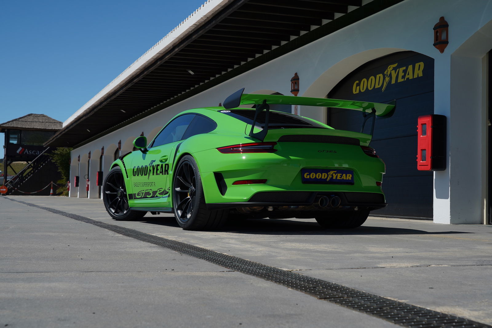 Dulcis in fundo, la Porsche 911 GT3 RS e quattro Goodyear Eagle F1 Supersport R. Pacchetto Weissach di alleggerimento incluso. Un oggettino che incute timore già da fermo, nel suo verde vipera, forte di 520 aspirati cv, capaci di urlare oltre gli 8.000 giri. I collaudatori sono chiari: “scalda bene le gomme prima di darci dentro e porta la frenata “nella” curva, senza lasciare troppo velocemente il pedale centrale”. Il teatro è la parte finale dell’Ascari, con un curvone parabolico a sinistra e una destra velocissima, condite con un paio di chicane. Capire dove finisce la magia della GT3 RS e dove inizia quella dei Supersport R è cosa quasi ultraterrena: di certo, la leggendaria precisione e la sensibilità di sterzo della 911 sono salve, anche grazie alle doti degli Eagle F1 Supersport. Resta da sciogliere il giudizio solo sulla resistenza all’usura: in queste occasioni, i giri concessi sono sempre, irrimediabilmente, troppo pochi.