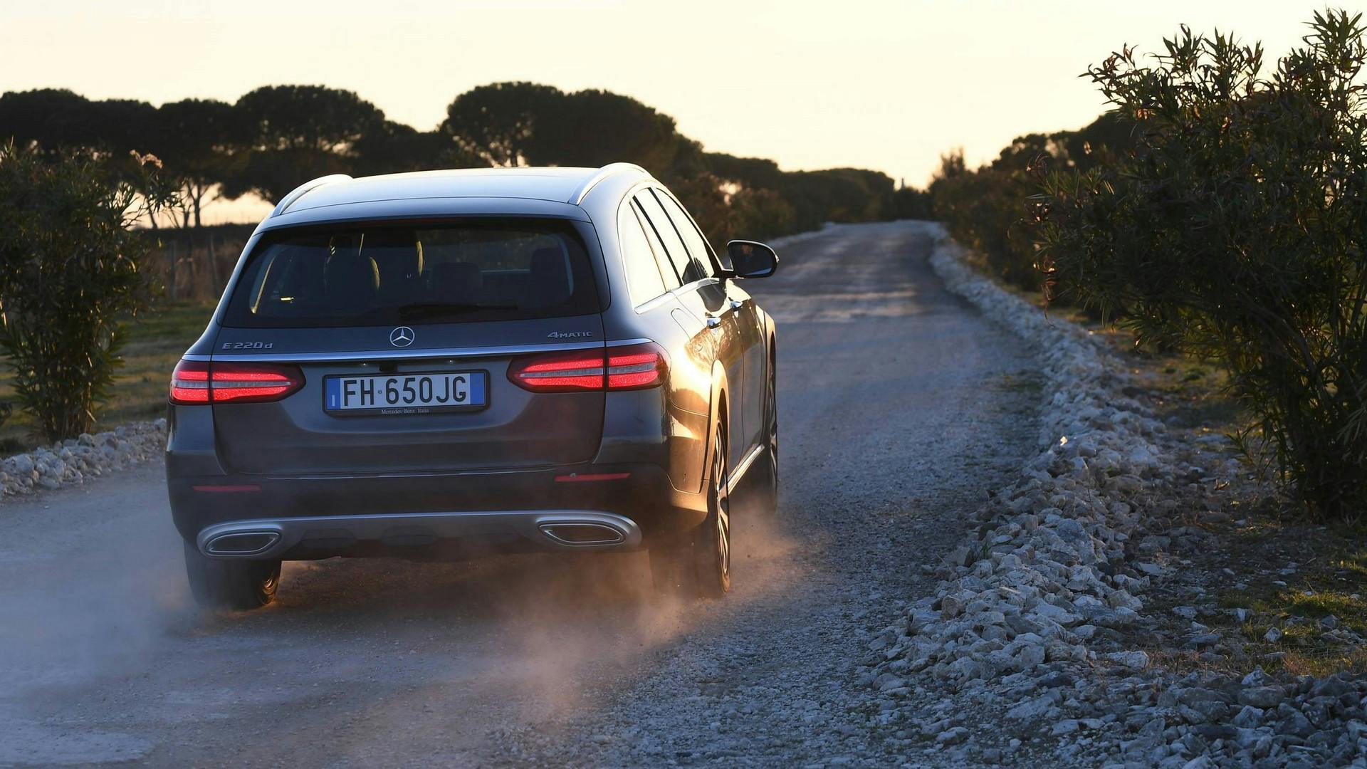 Derivata da Classe E SW, l’inedita versione All-Terrain è immediatamente riconoscibile per le protezioni plastiche a contrasto lungo i paraurti, gli archi dei passaruota e le minigonne, così come per le slitte di protezione sottoscocca in corrispondenza sia dell’avantreno sia del retrotreno. Non mancano inoltre una calandra specifica a due sole lamelle, simile alle SUV della Stella, e cerchi in lega da 19 o 20 pollici dal design dedicato, abbinati a pneumatici dalla spalla particolarmente generosa a tutto vantaggio dell’assorbimento delle asperità. Quest’ultima una reinterpretazione del tradizionale concetto di sportività, così da abbinare l’aspetto aggressivo a un comportamento funzionale tanto alla marcia lontana dall’asfalto quanto al comfort su strada.L’abitacolo, pressoché identico alle versioni standard, è fortemente caratterizzato dalla generosa estensione della plancia, che può fregiarsi di finiture in radica/alluminio, e dalla presenza del “tablet panoramico” a doppio schermo da 12,3 pollici per visualizzare sia le informazioni affidate alla strumentazione sia le opzioni del sistema d’infotainment. La grafica è ampiamente personalizzabile e, optando per lo specifico programma di marcia All Terrain, è possibile tenere sotto controllo parametri specifici quali l’angolo di sterzo, l’inclinazione della vettura, l’altezza da terra e l’orientamento dell’auto rispetto ai punti cardinali. Nulla varia quanto ad abitabilità, da tradizione generosa sia per guidatore e passeggero anteriore sia per gli occupanti del divanetto frazionabile 40/20/40, così come per quanto concerne la capienza del bagagliaio, forte di 670/1.820 litri anziché i 695/1.950 litri appannaggio della precedente generazione. Una lieve riduzione legata a un design meno “funebre” del portellone e, in generale, della linea di coda. Una piccola, anzi piccolissima rinuncia sotto il profilo funzionale, un netto passo avanti a livello stilistico. Più che il design o il layout dell’abitacolo è la tecnica a differenziare la Classe E SW All-Terrain dalle “sorelle” standard. Alla trazione integrale permanente 4Matic, con ripartizione della coppia 45:55 tra gli assali in condizioni ordinarie, si accompagnano le sospensioni pneumatiche autolivellanti Air Body Control (di serie) che portano in dote un assetto base rialzato di 29 mm e permettono di incrementare l’altezza minima da terra da 12,1 a 15,6 cm. Un valore non troppo distante da quanto appannaggio della maggioranza delle crossover. Ottimizzata in funzione della marcia fuoristrada anche la mappatura del cambio automatico. Ricca, anzi ricchissima la dotazione di sicurezza che, optando per il pacchetto Assistenza alla guida (da 2.318 euro), include la guida semi-autonoma: la vettura agisce da sola sullo sterzo e mantiene la velocità prescelta e la distanza di sicurezza dal veicolo che precede, frenando automaticamente in caso d’emergenza. A patto che il guidatore si mantenga vigile, quindi con le mani sul volante, pena la disattivazione del sistema.DRIVEArriva dove nessuno si aspetta possa spingersi una Classe E SW. La versione All-Terrain porta infatti in dote una polivalenza sconosciuta alla wagon della Stella, oltre a un comfort degno di un’ammiraglia. Caratteristiche che ne fanno la vettura ideale per quanti vogliono affrontare senza preoccupazioni le dissestate strade cittadine oppure ambiscono a muoversi in scioltezza lungo passi alpini e fondi a ridotta aderenza, spingendosi anche lontano dall’asfalto. Tanta duttilità è legata principalmente alla luce da terra di 15,6 cm, sufficiente per non abradere il sottoscocca in presenza di dossi e avvallamenti, alle straordinarie capacità di assorbimento delle sospensioni pneumatiche adattive e, chicca tecnica condivisa con le SUV di casa Mercedes, alla disponibilità di un programma di marcia specifico.