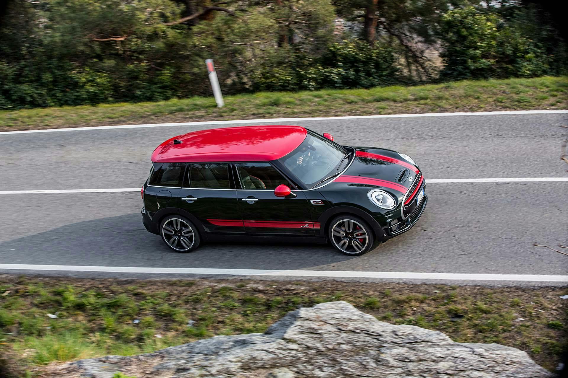 Non piccolaNegli anni la MINI è cresciuta centimetro dopo centimetro e questa Clubman è meno “MINI” che mai: lunga 4.253 mm (7 cm in meno della BMW Serie 1), larga 1.800 mm, alta 1.441 mm, la MINI Clubman JCW ALL4 pesa più del doppio della prima, originale Morris Mini-Minor: 1.475 kg in ordine di marcia (15 kg in più per l’automatica). Il bagagliaio è generoso, considerato il marchio di appartenenza: 360/1.250 litri. La trazione è integrale permanente, come su tutte le versioni ALL4: sull’assale anteriore lavora un differenziale autobloccante elettronico chiamato EDLC (optional), che frena la ruota con minor grip. Le sospensioni hanno uno schema collaudato: MacPherson davanti e Multilink dietro, mentre i cerchi hanno diametro di 18” (optional 19”).Serve assistenza I sistemi di assistenza alla guida sono numerosi: ABS, ripartizione elettronica della forza frenante (EBD) e assistenza di frenata in curva (CBC), Dynamic Stability Control (DSC), compensazione del fading e Dynamic Traction Control (DTC). Optional il pacchetto MINI Connected, che consente di collegare lo smartphone all’auto e utilizzare una lunga serie di applicazioni.Quanto mi costaLa MINI Clubman JCW ALL4 è disponibile in 12 combinazioni cromatiche (4 pastello, 8 metallizzate), tutte con pinze freno rosse griffate JCW (il logo JCW è sparso qua e là tra interni ed esterni), e una chilometrica lista di optional, tra cui la telecamera posteriore, i sensori di parcheggio, il cruise control adattivo, l’impianto audio Harman Kardon e l’Head-Up display. Attenzione, perché il conto può salire parecchio, come nel caso dell’auto in prova, che con questi e altri optional tocca quota 52.200 euro.  DRIVE